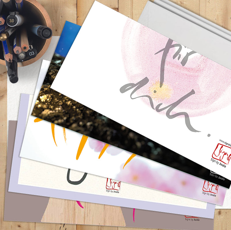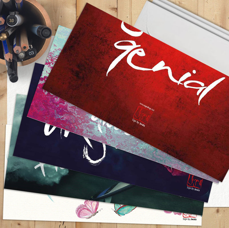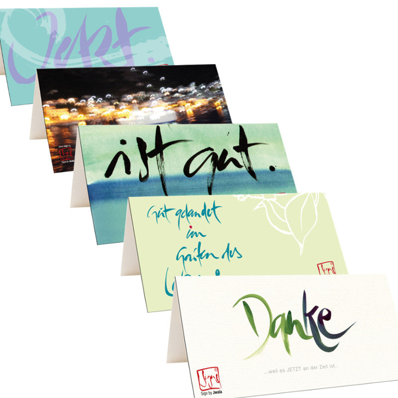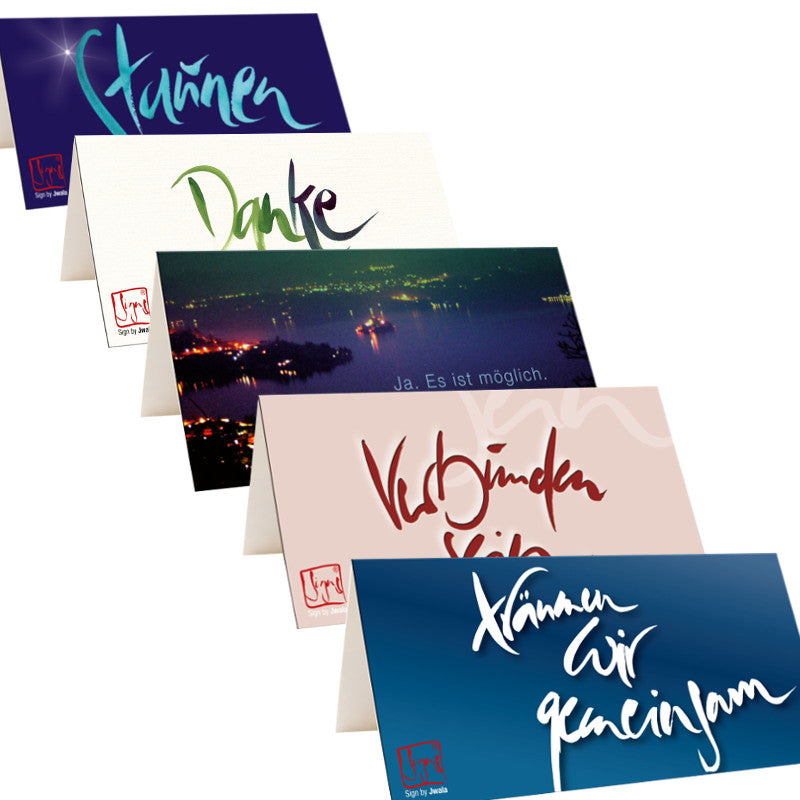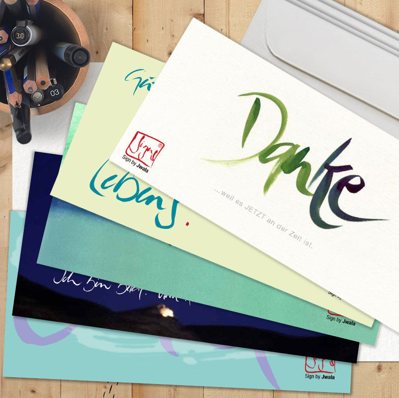Suchst du nach besonderen Klappkarten mit Kuverts, die Herz und Seele berühren? Unsere Grußkarten-Wundertüte überrascht dich mit 10 einzigartigen Klappkarten aus der gesamten Signs by Jwala® Kollektion – jede Tüte ist individuell und liebevoll zusammengestellt. Auch Karten, die nicht mehr im Shop erhältlich sind, können dich hier erfreuen. Zu jeder Karte erhältst du ein hochwertiges, naturweißes Kuvert.