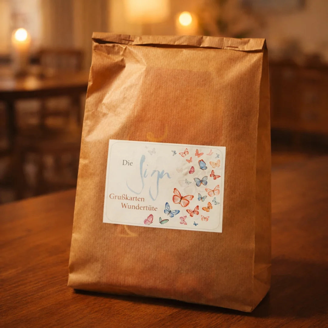 Lass dich von den inspirierenden Motiven und Botschaften überraschen und spüre die Freude, die beim Packen jeder einzelnen Tüte mit eingeflossen ist. Wir sind sicher: Die Karten, die dich erreichen, sind genau die richtigen für dich und deine Herzensmenschen. Jede Grußkarten-Wundertüte ist ein liebevoll verpacktes Unikat – ideal zum Verschenken, Sammeln oder um einfach jemandem ein Lächeln zu schenken.