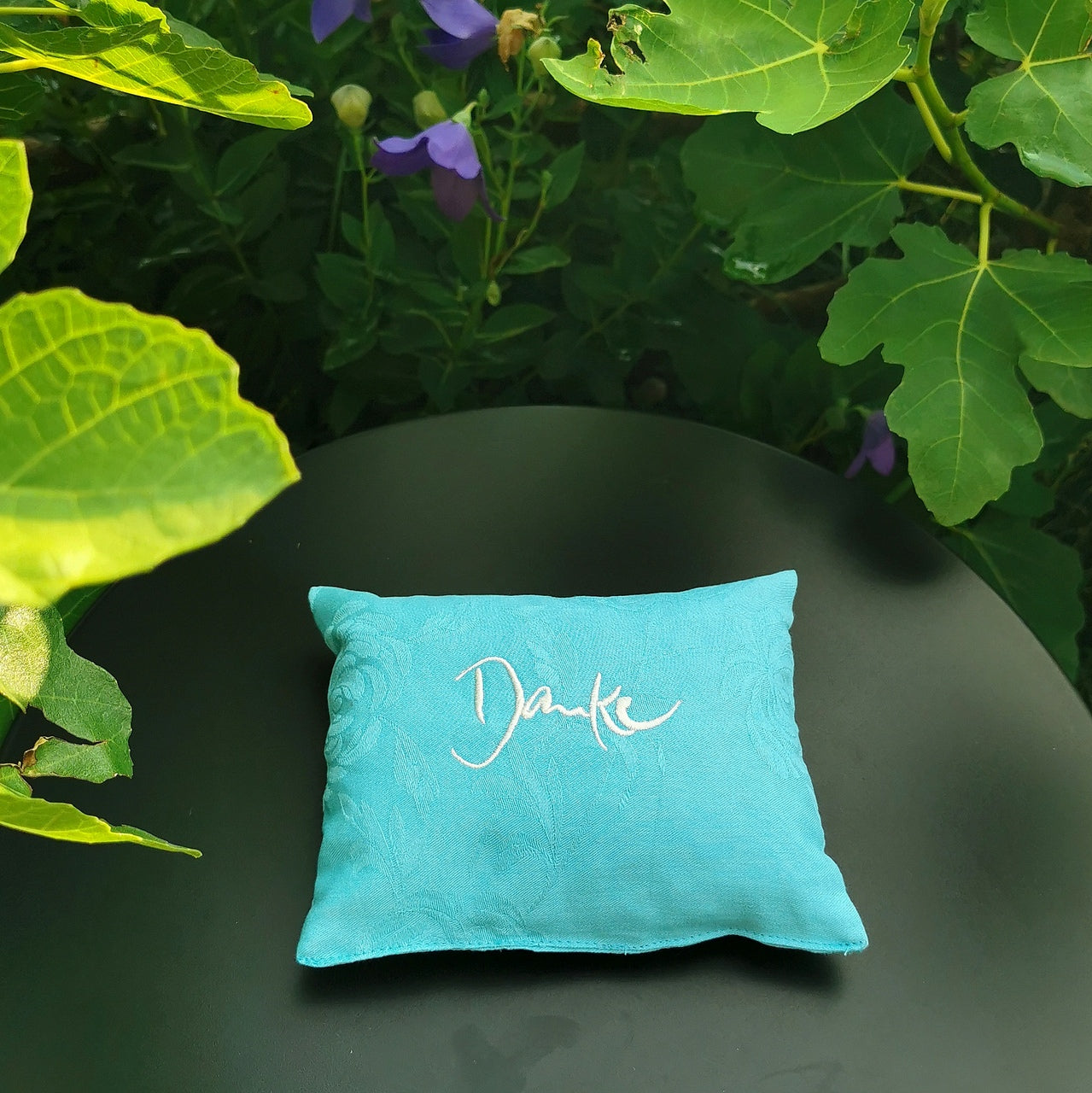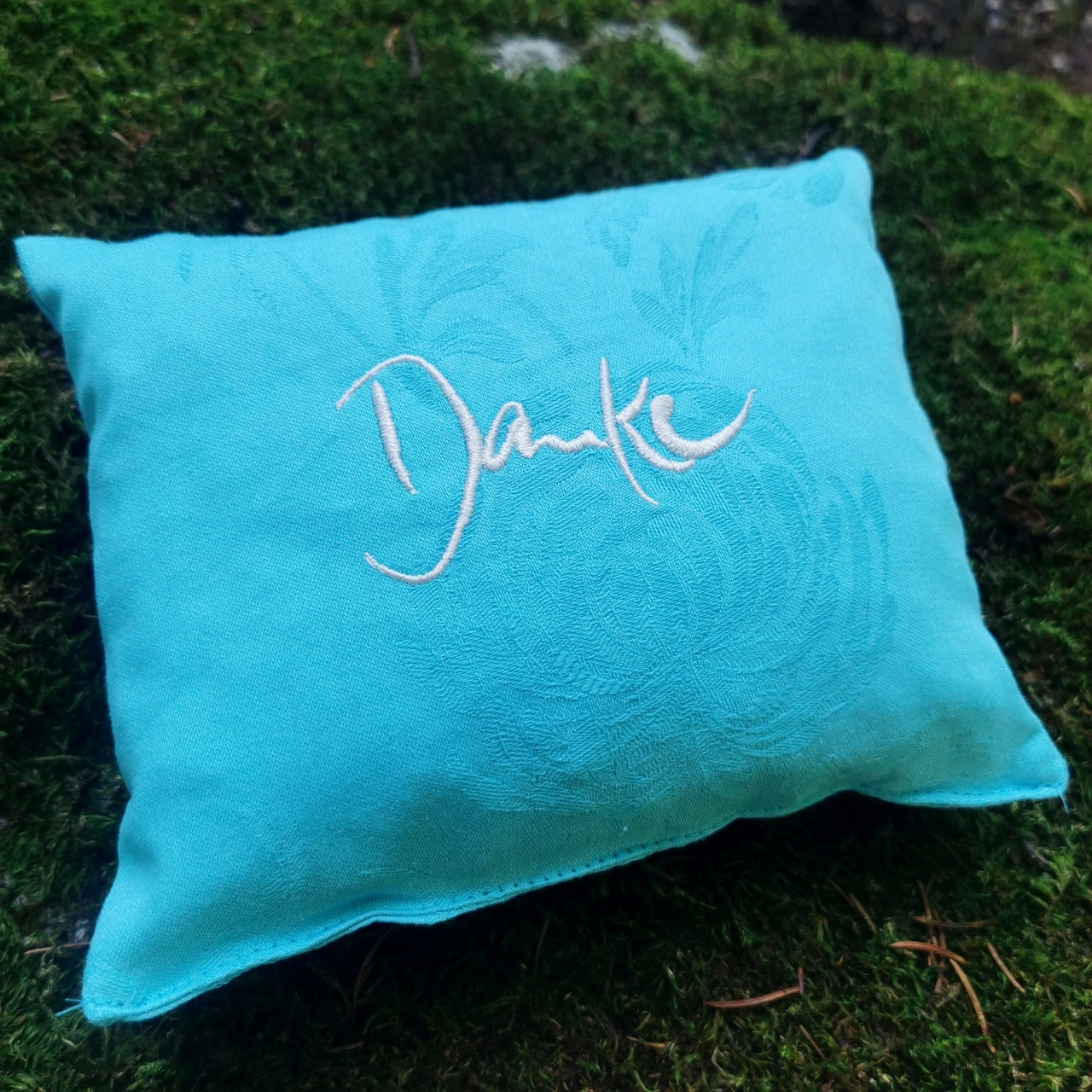 Details: Farbe: Türkis Größe: 18 × 14 cm Material: Handgefärbte, strukturierte Baumwolle Stickerei: „Danke“ (Sign by Jwala®) in Weiß Füllung: Zirbenholzflocken aus Tirol Handgefertigt in der Claudiaschlössl-Manufaktur