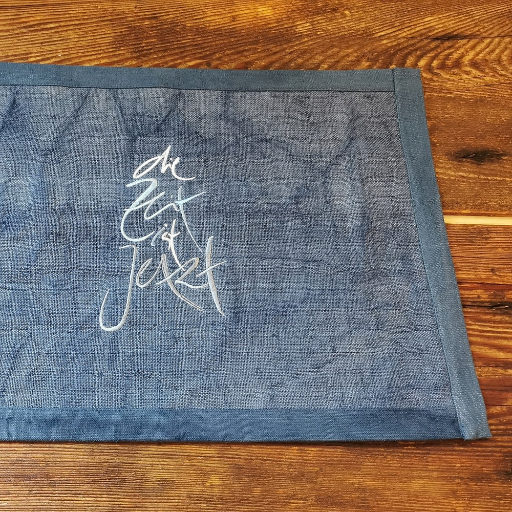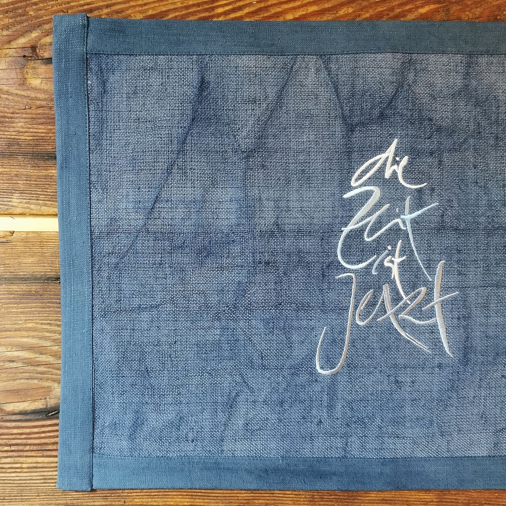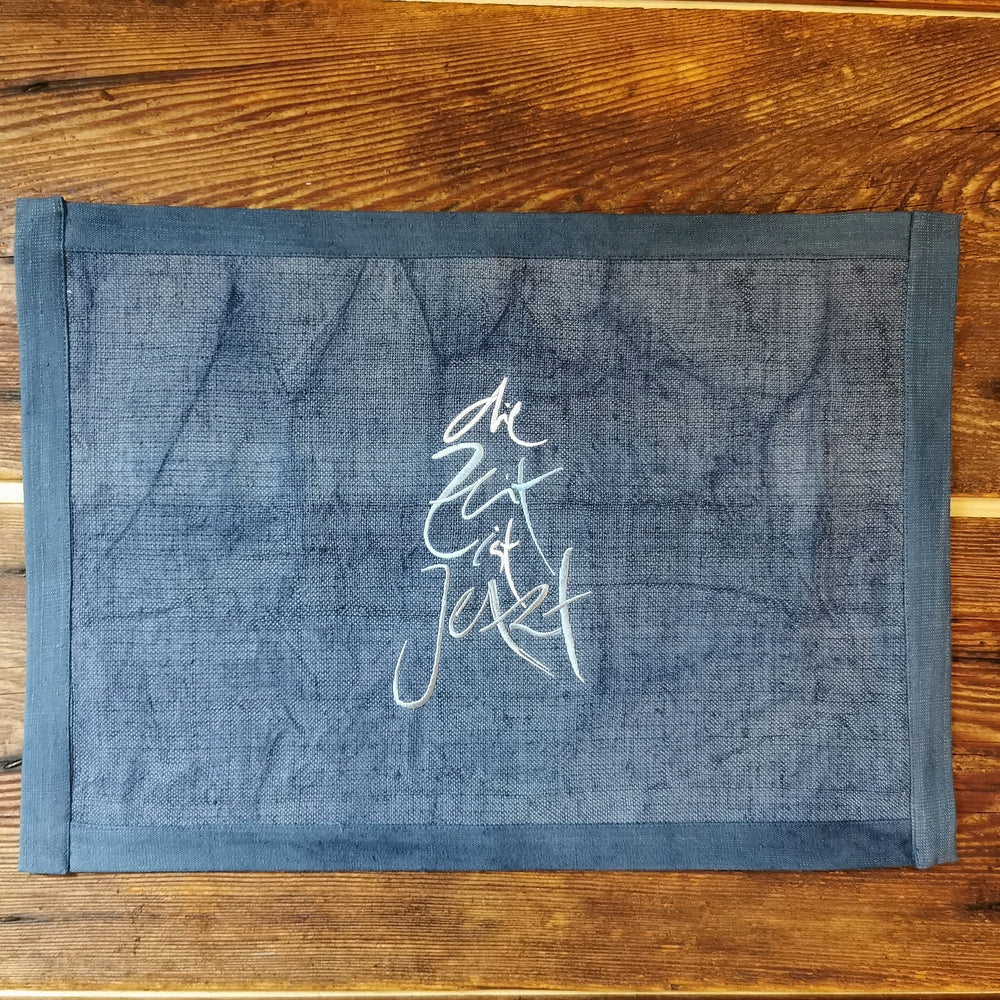 Setze stilvolle Akzente mit diesem außergewöhnlichen Tischset: Die Kombination aus grobem, antikem Bauernleinen im Mittelteil, feinem Leinen in der Einfassung und der farblich abgestimmten Stickerei „die Zeit ist Jetzt“ - Sign by Jwala® in Silber-Hellblau macht jedes Stück zu einem besonderen Blickfang. In Tirol von Hand genäht, gefärbt und bestickt, ist jedes Tischset ein limitiertes Unikat, das deinem Esstisch Charakter und Wertigkeit verleiht. Pflegeleicht und langlebig – perfekt für alle, die das Besondere suchen.