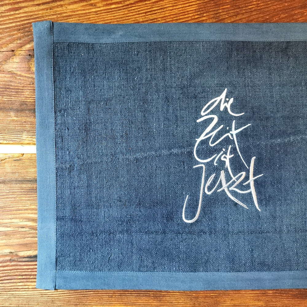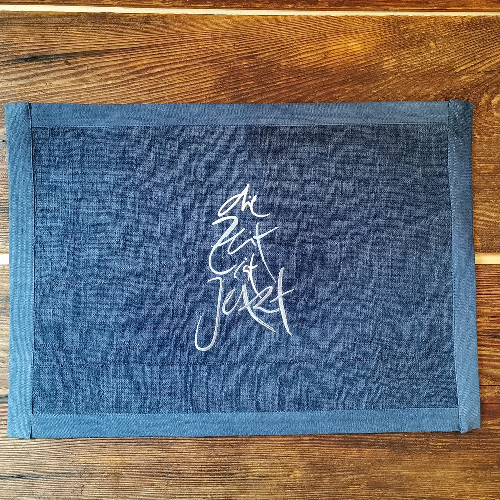 Verleihe deinem Tisch eine besondere Note mit diesem außergewöhnlichen Tischset: Hochwertig verarbeitet aus grobem und feinem Bauernleinen, begeistert es durch die stilvolle Stickerei „die Zeit ist Jetzt“ (Sign by Jwala®) im sanften Silber-Hellblau-Verlauf. Jedes Set wird in Tirol von Hand genäht, gefärbt und bestickt – ein exklusives Unikat, das nicht nur durch seine Optik, sondern auch durch langlebige Qualität überzeugt. Perfekt für alle, die außergewöhnliche Tischsets mit besonderer Ausstrahlung suchen. Nur in kleiner Stückzahl erhältlich!