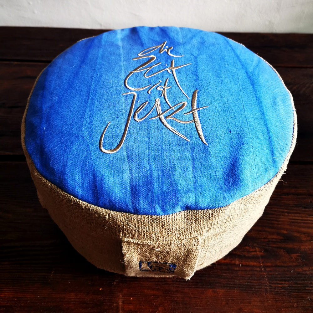 Handgemachtes Meditationskissen aus Bauernleinen – Sitzkissen „die Zeit ist Jetzt“ mit Dinkelspelz-Füllung