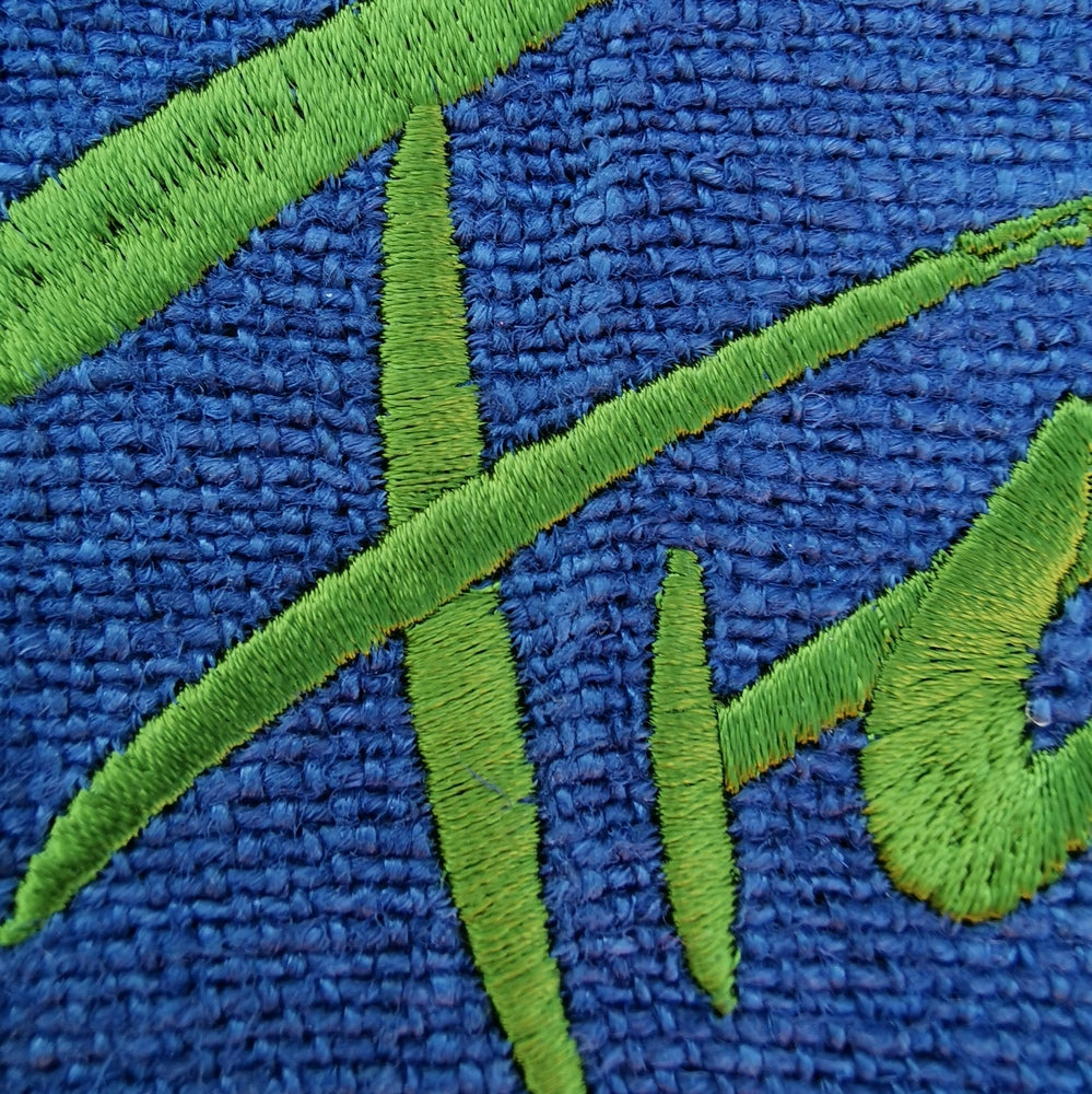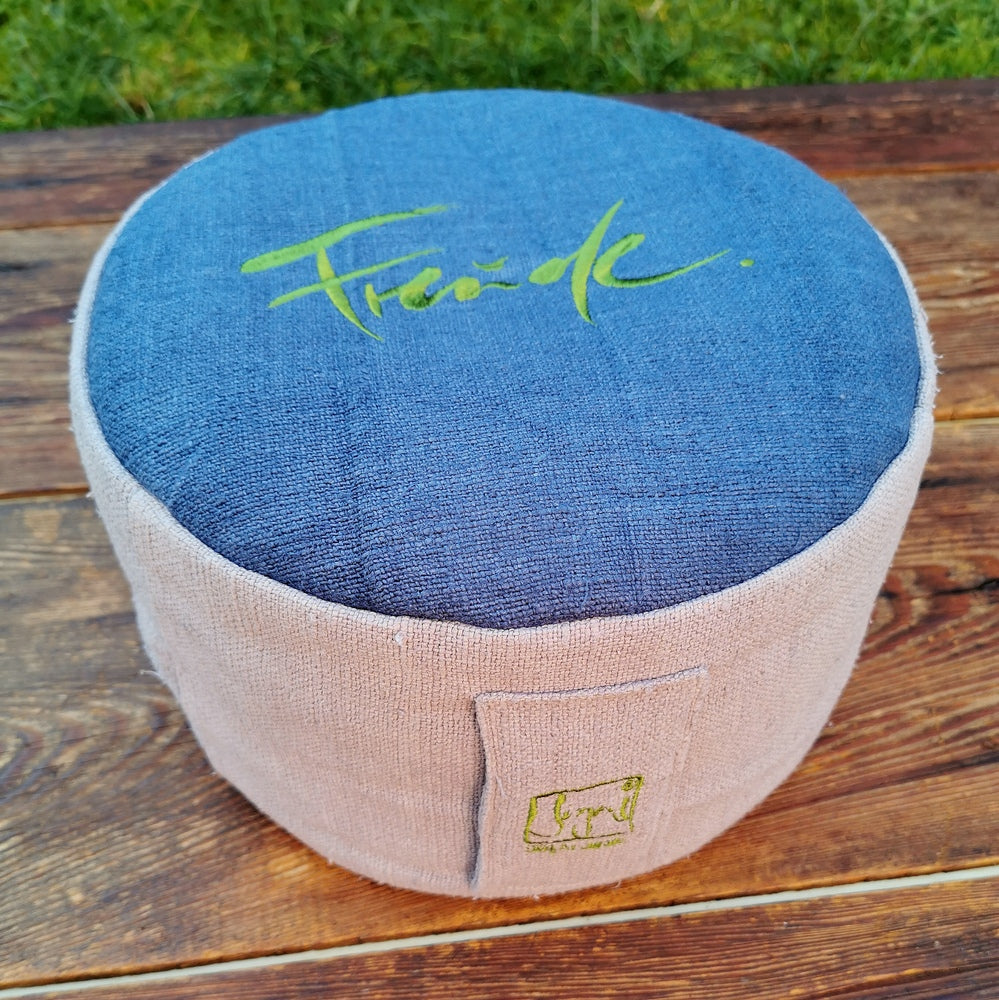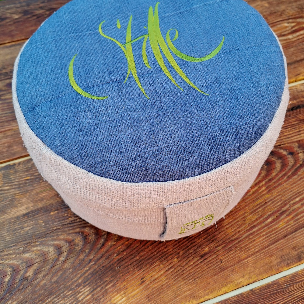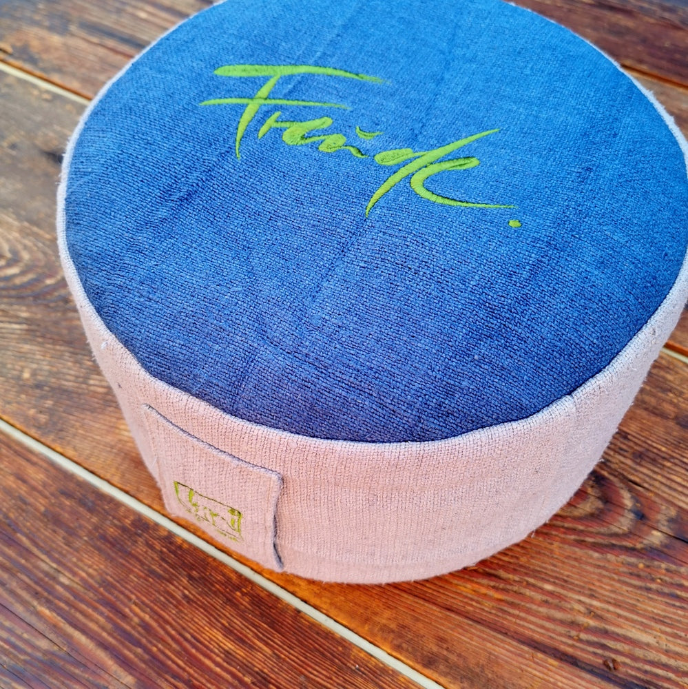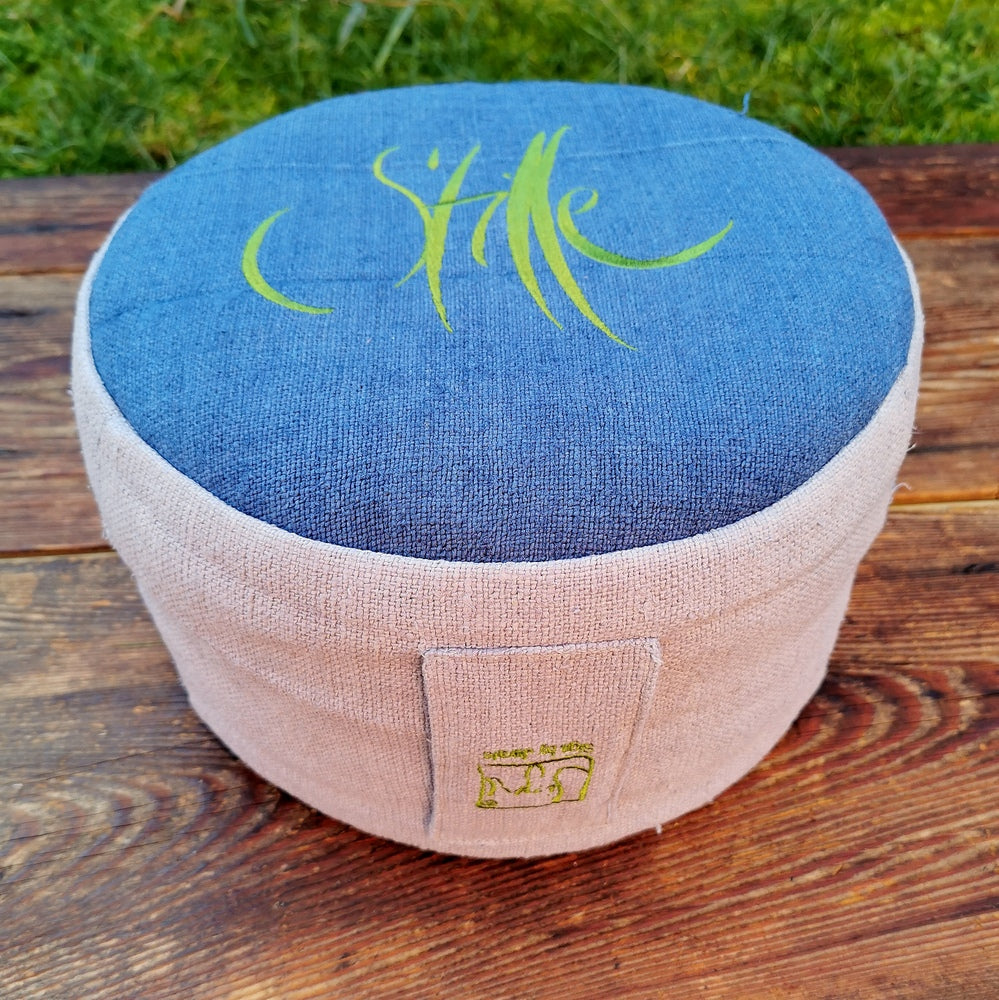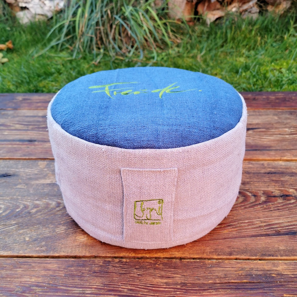 Besonderes Meditationskissen aus handgewebtem Bauernleinen – Sitzkissen mit Dinkelspelz-Füllung und inspirierender Stickerei