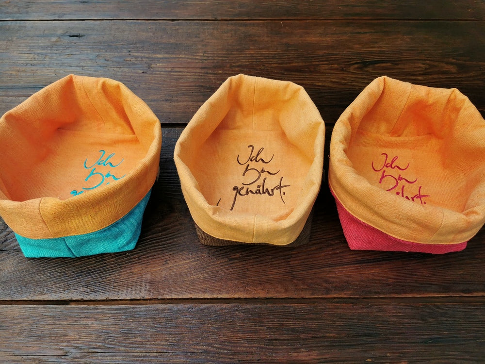 Bereichere deinen Esstisch mit dem einzigartigen Brotkörbchen „Ich bin genährt“ aus handgewebtem, antikem Bauernleinen – liebevoll gefertigt in der Claudiaschlössl-Manufaktur in Tirol. Die edle Stickerei „Ich bin genährt“ (Sign by Jwala®) in Silber auf dem Boden des Körbchens macht jedes Stück zu einer täglichen Inspiration für achtsames Genießen und echte Wertschätzung. Das über 100 Jahre alte, handgefärbte Leinen und die limitierte Kleinserie machen dieses Brotkörbchen zu einem besonderen Geschenk und einem echten Schmuckstück für deine Tischkultur.