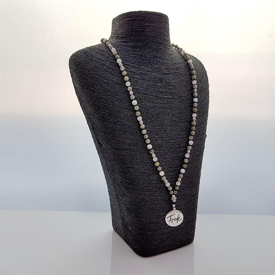 Jede handgefertigte Mala ist mit viel Liebe zusammengestellt und wird mit einem hohen Zeitaufwand geknüpft: Zwischen jede der 108 Perlen kommt ein händisch geknüpfter Knoten. Diese Mala ist ein UNIKAT - es gibt sie nur einmal - und ist sofort lieferbar.