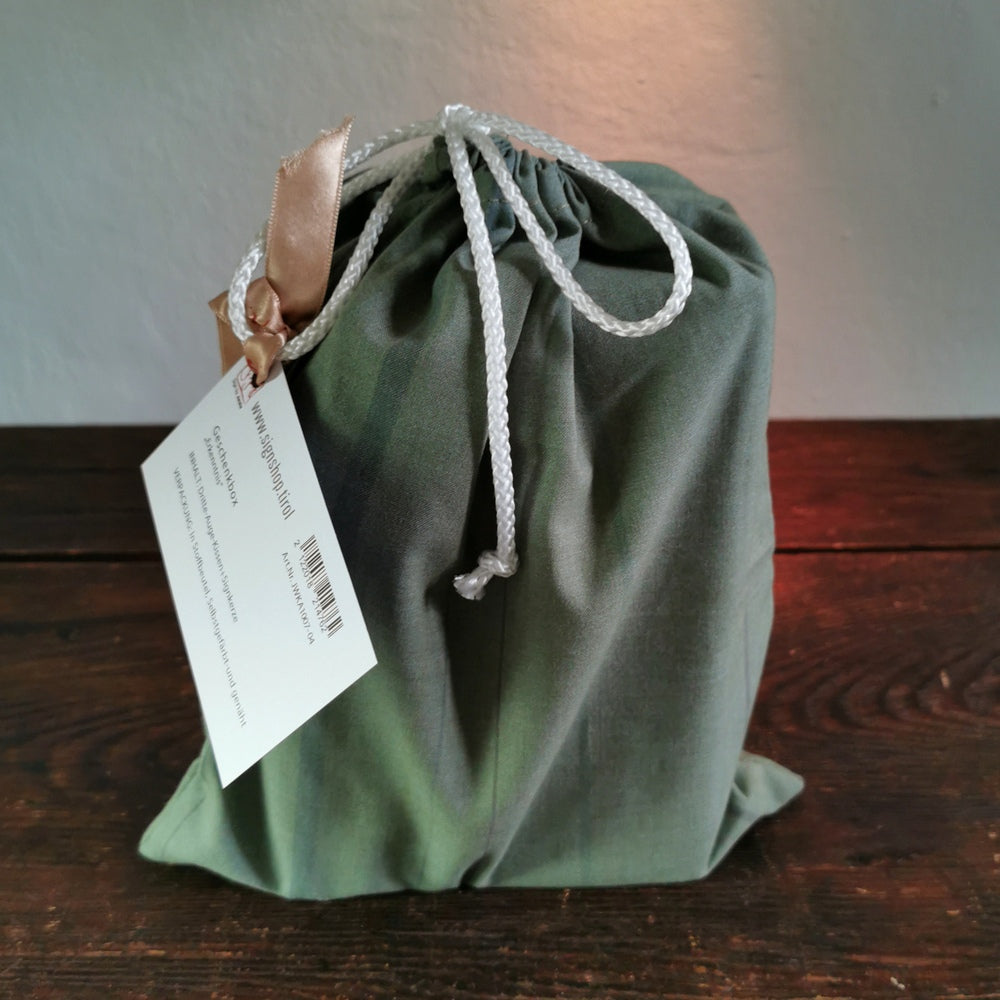 Gratis & exklusiv: Das gesamte Set wird in einem handgenähten, selbstgefärbten Stoffbeutel verpackt und mit einem inspirierenden Text auf einem DIN A4-Blatt im Transparent-Kuvert liebevoll ergänzt – Geschenkverpackung und Brief sind inklusive.