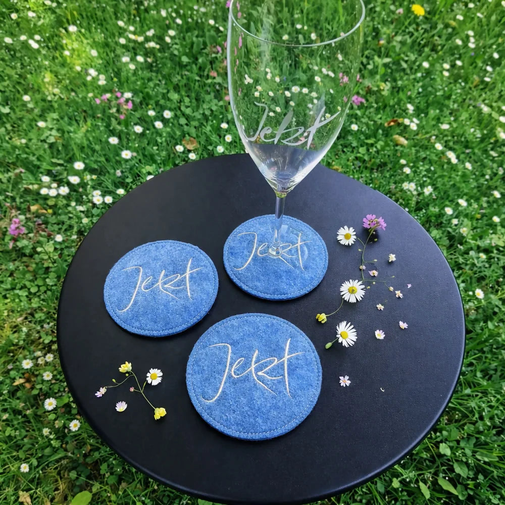 Unsere Glasuntersetzer „Jetzt“ sind feine Sign-Seelenstücke – gefertigt aus 100 % Wollwalk von Giesswein/Tirol und liebevoll bestickt mit dem Sign „Jetzt“ (Sign by Jwala®).