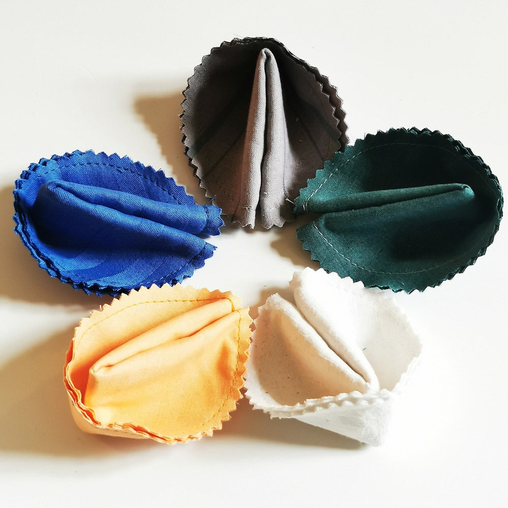 Einzigartige Handarbeit: Jeder Glückskeks ist aus handgewebtem, handgeschnittenem und selbstgefärbtem Bauernleinen gefertigt – jedes Stück ein Unikat.