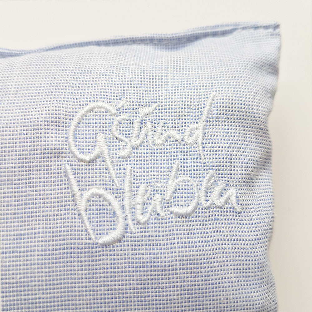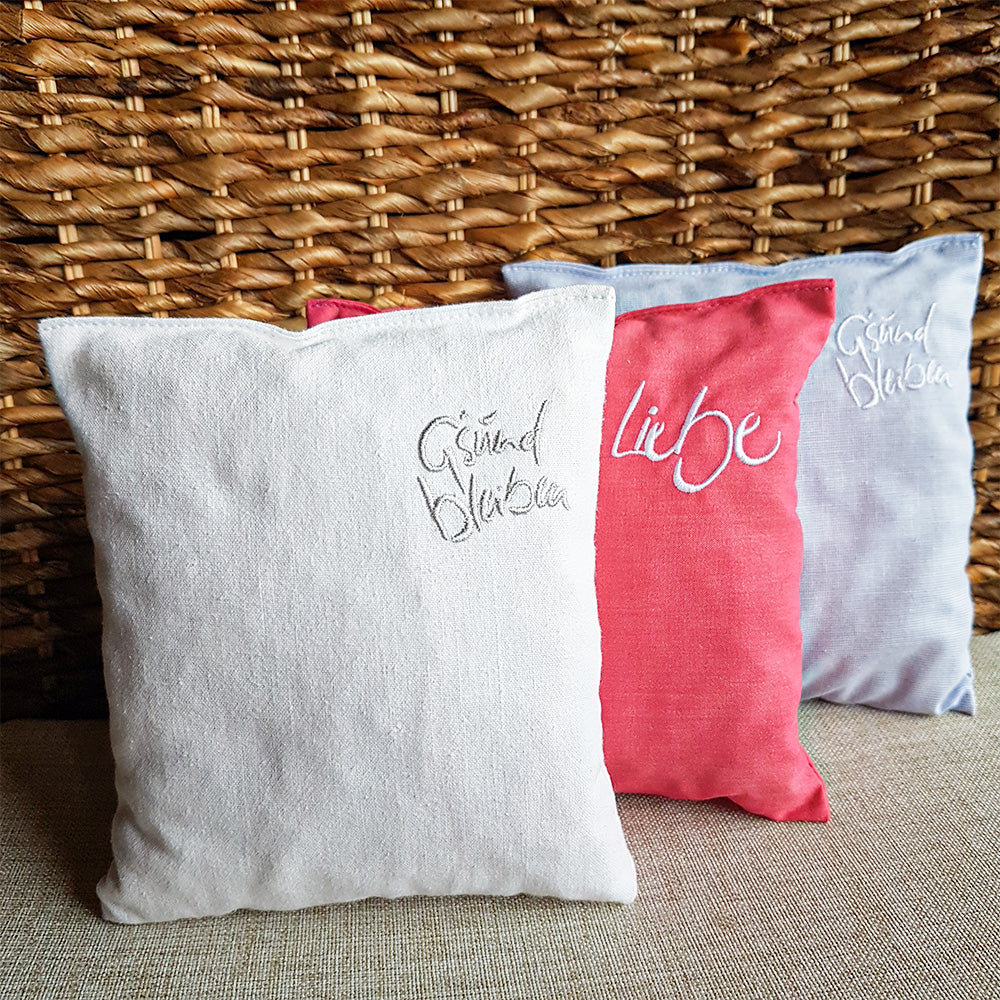 In diesem kleinen, bestickten Zirbenkissen steckt geballte Kraft: gefüllt mit Zirbenholzflocken aus dem Tiroler Hochgebirge, die für ihre wohltuenden Eigenschaften bekannt sind.