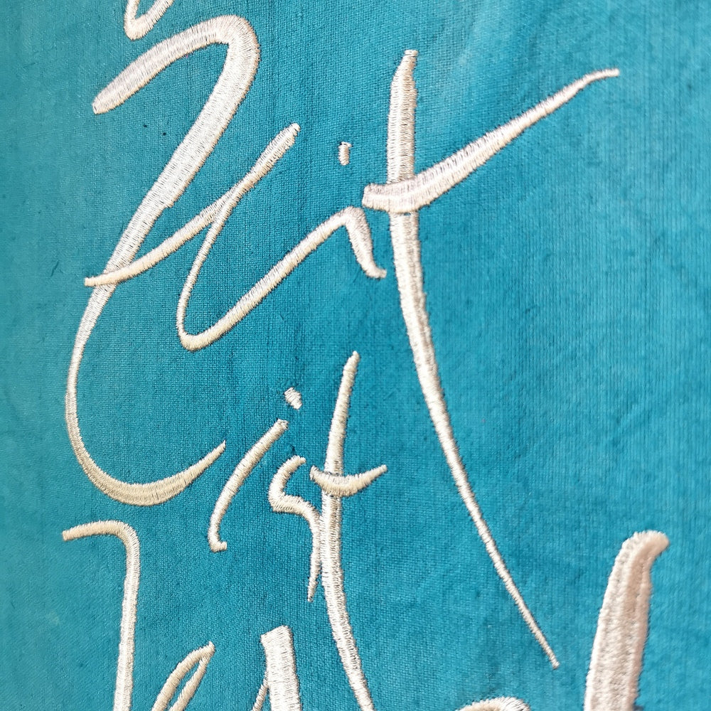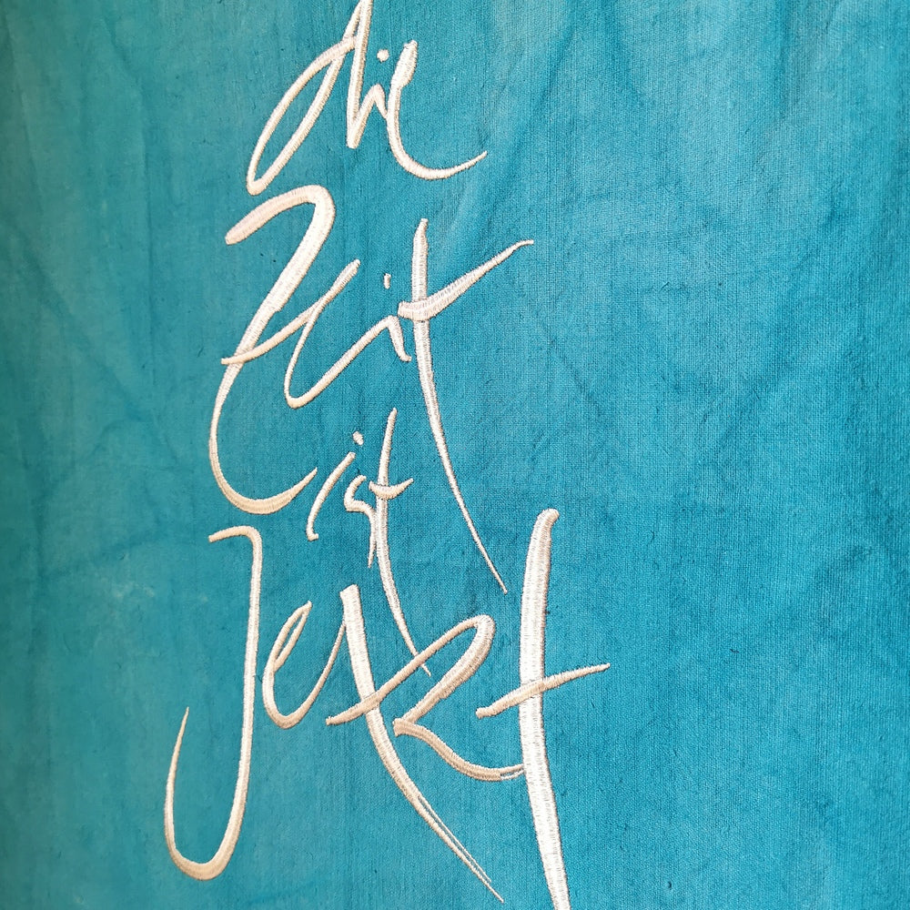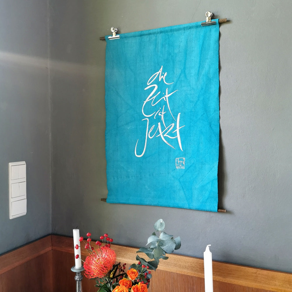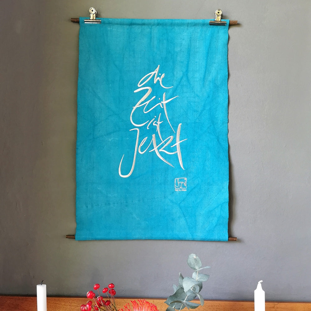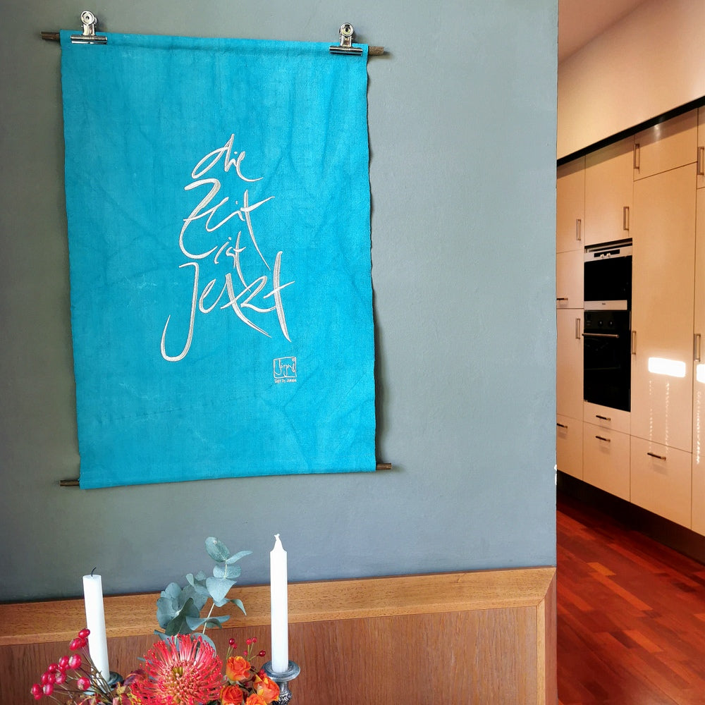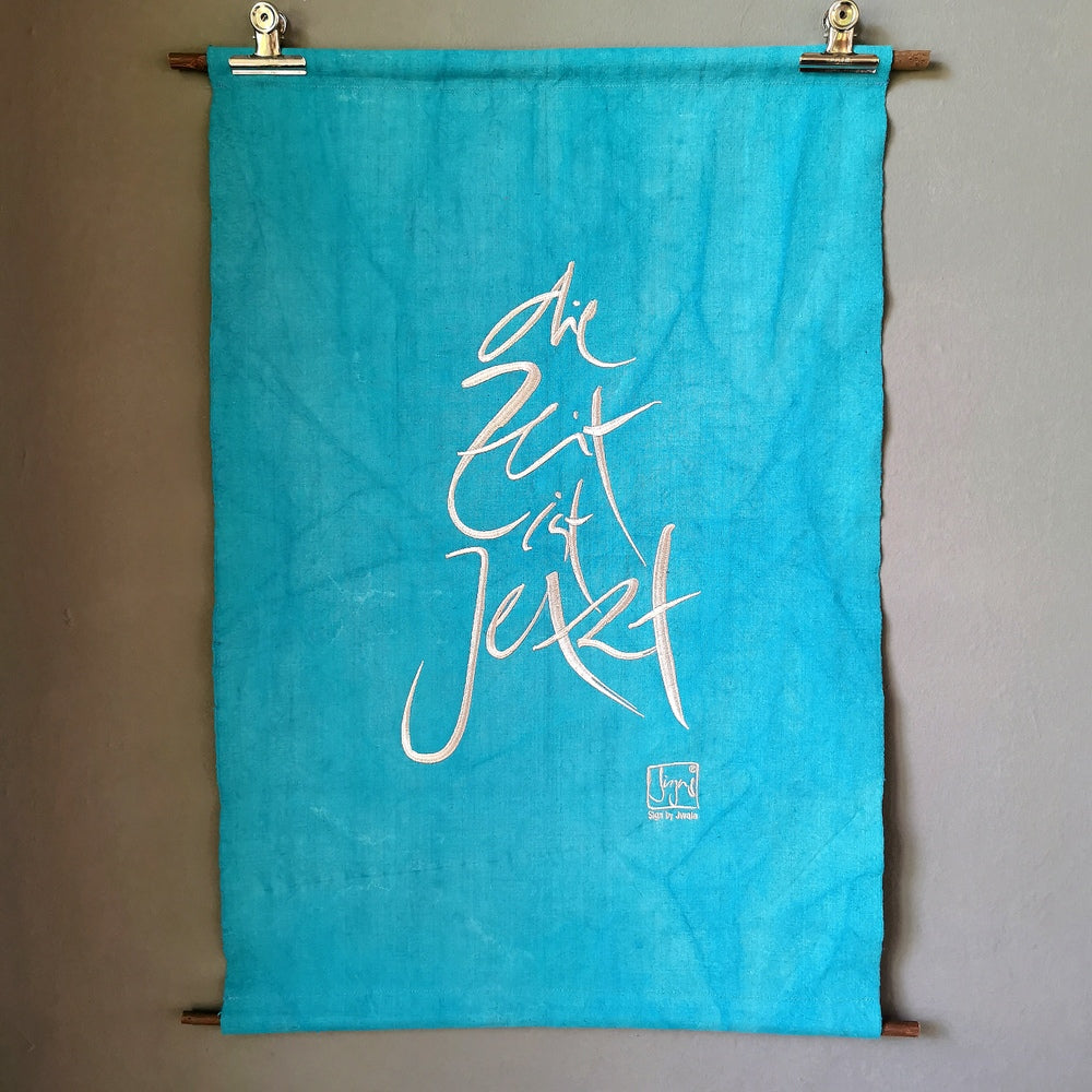 Die Stickerei, wie hier das Sign „Die Zeit ist Jetzt“ (Sign by Jwala®), wird mit höchster Sorgfalt in Tirol aufgebracht. Auf 22 Stücke limitiert und nummeriert, ist jeder Haussegen ein Unikat, das die Energie von Raum und Bewohnern positiv beeinflusst.