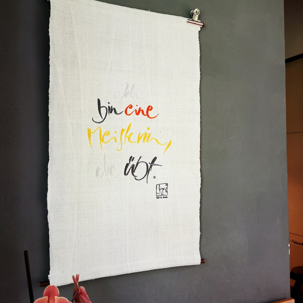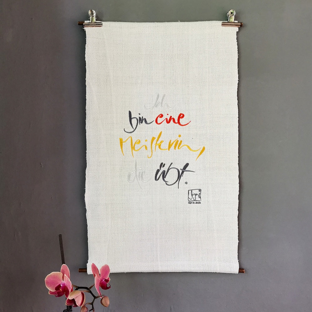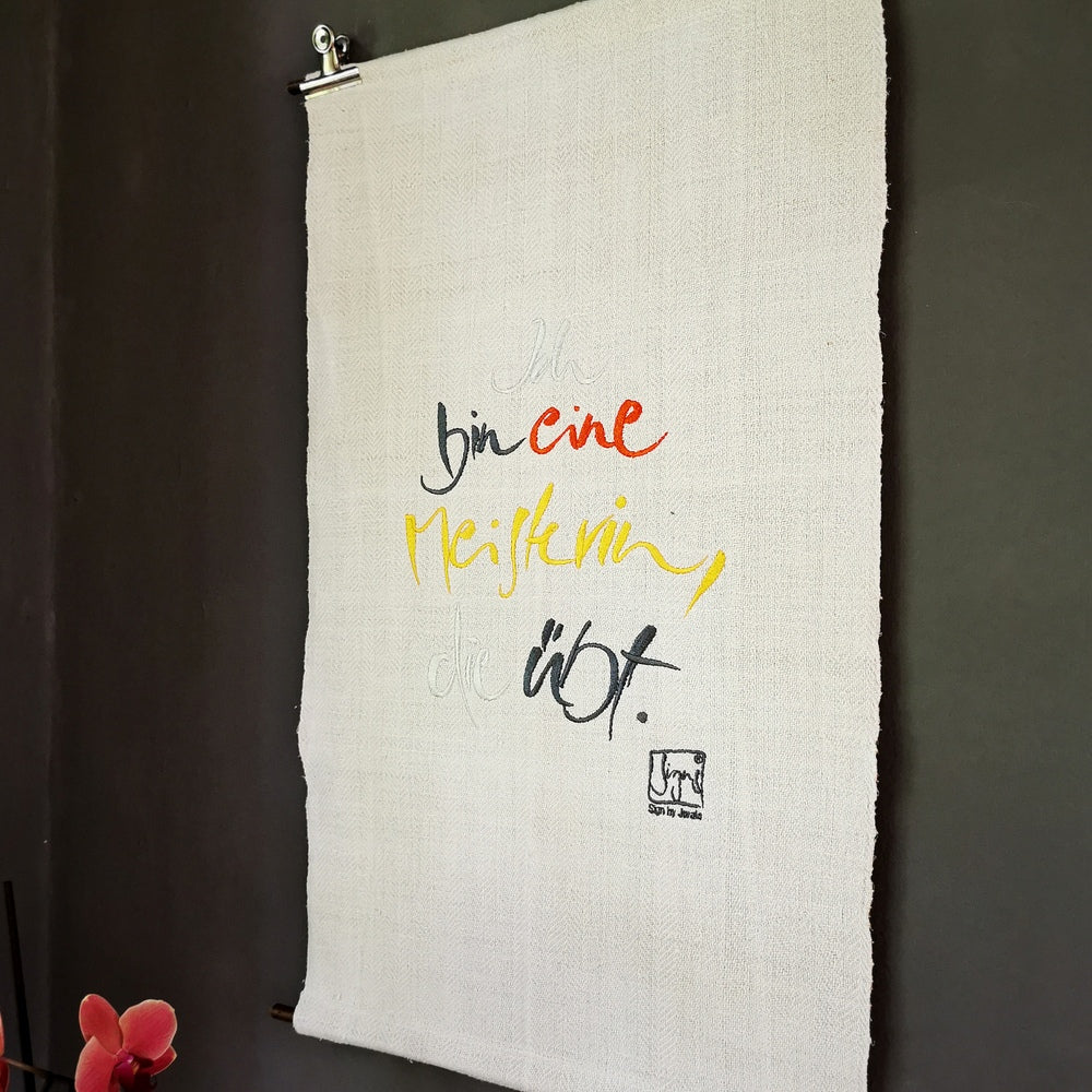 Besonderer Wandteppich als Wanddekoration – Sign-Haussegen „Ich bin eine Meisterin, die übt.“