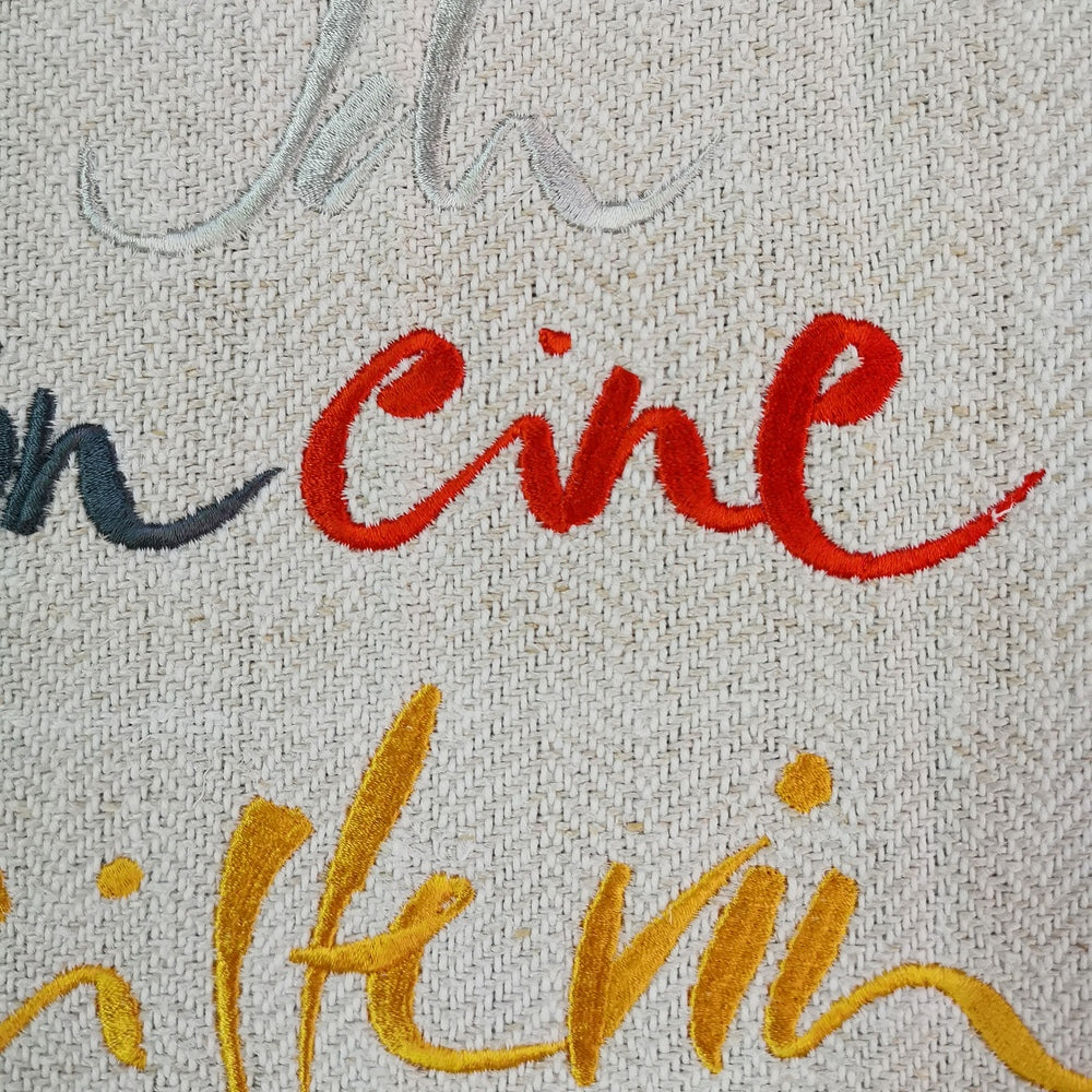 Jeder Wandteppich wird in der Claudiaschlössl-Manufaktur aus grobem, handgewebtem Vintage-Bauernleinen gefertigt – ein Stück Geschichte, das liebevoll vorgewaschen, genäht und mit edler Stickerei in Silber, Orange und Gelb veredelt wird. Die Worte „Ich bin eine Meisterin, die übt.“ (Sign by Jwala®) erinnern täglich an das Wachsen, Üben und an die Kraft der Manifestation.