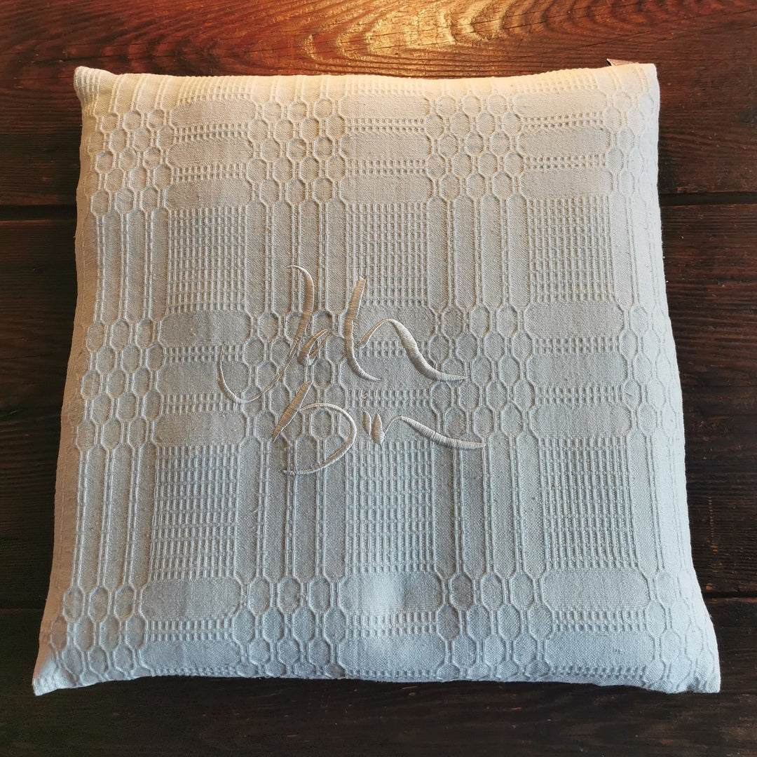Produktdetails: Farbe Hülle: Creme (Bauernleinen mit Waffelmuster) Stickerei: „Ich bin“ (Sign by Jwala®) Größe: 40 × 40 × ca. 4 cm Material Hülle: 100 % handgewebtes Vintage-Bauernleinen, vorgewaschen Füllung: Schweres, festes Innenkissen aus Baumwolle (nicht waschbar) Reinigung: Hülle bei 60 °C, schonend schleudern, mit viel Dampf bügeln