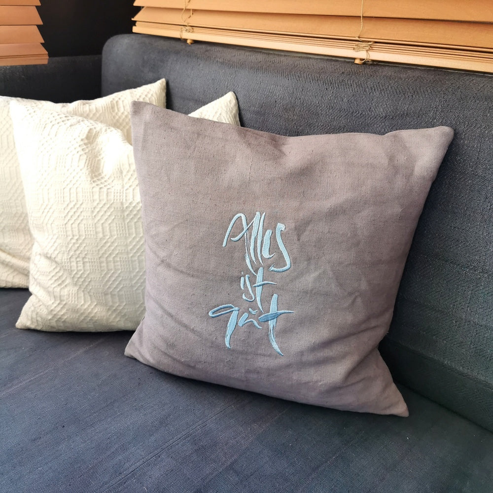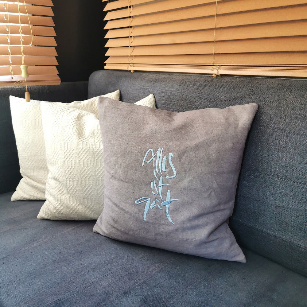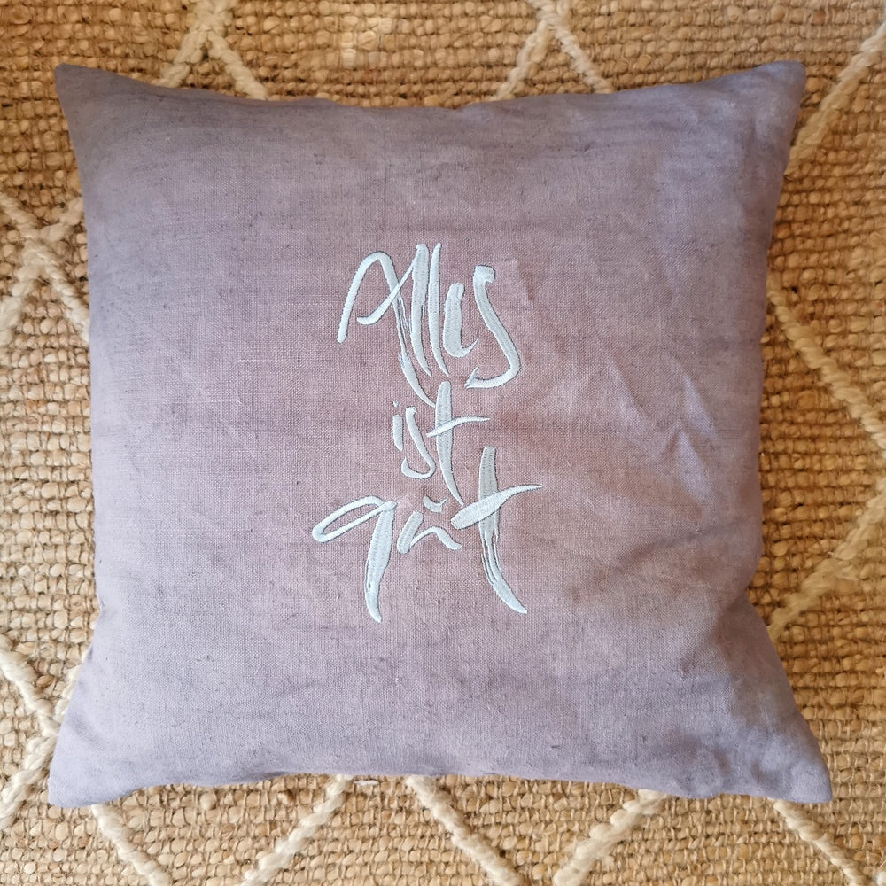 Kissenhülle „Alles ist gut“ aus antikem Bauernleinen – Ein Unikat aus Tirol