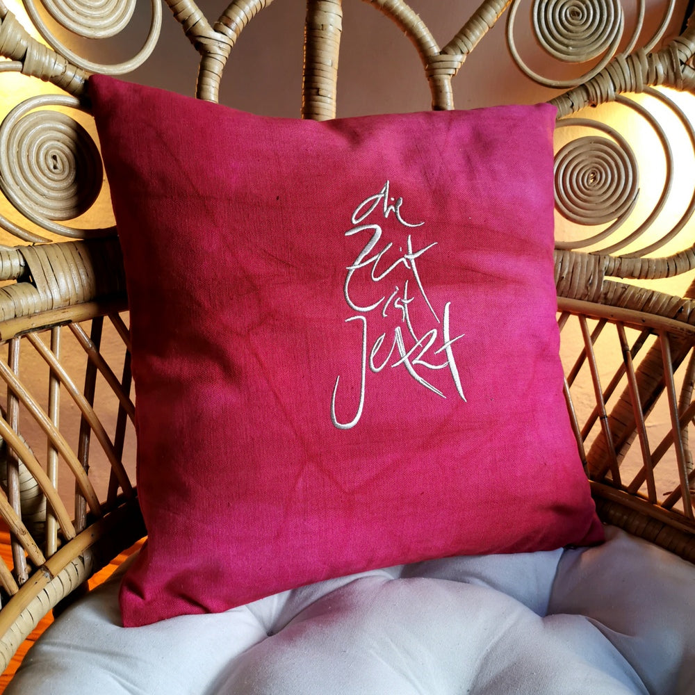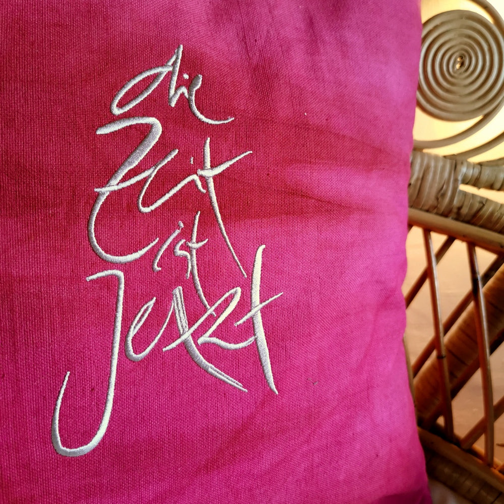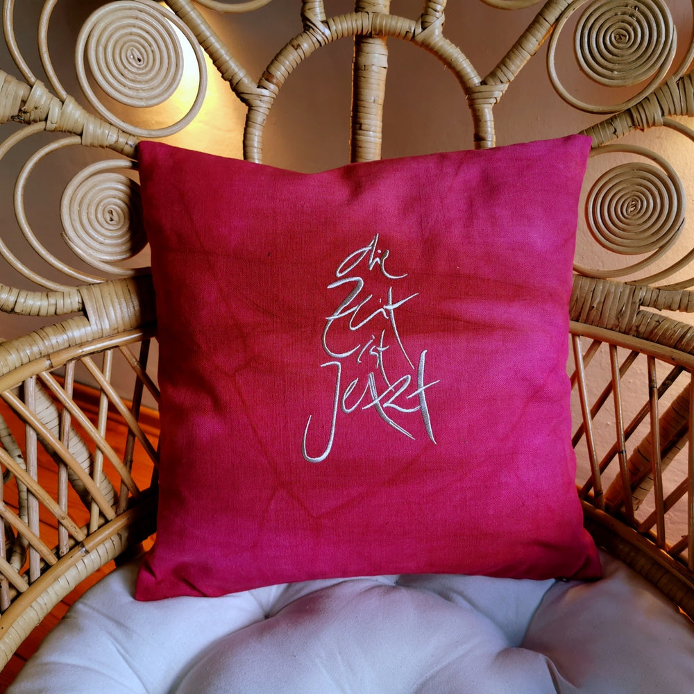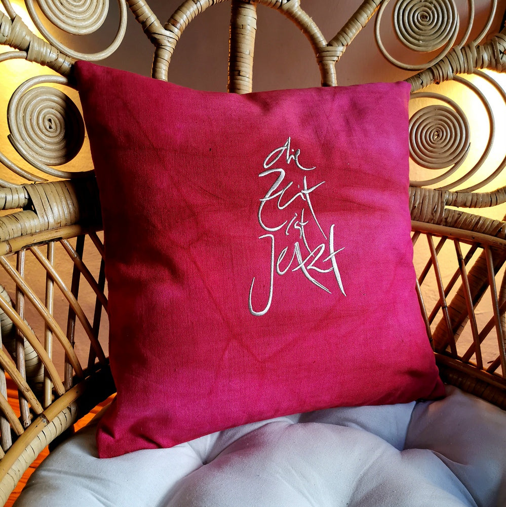 Erlebe mit der Kissenhülle „Die Zeit ist Jetzt“ aus dem SignShop Tirol ein exklusives Wohnaccessoire, das Achtsamkeit, Präsenz und stilvolle Handwerkskunst vereint. Dieses Unikat (40 x 40 cm, ohne Innenkissen) ist aus handgewebtem Vintage-Bauernleinen gefertigt und von Jwala in liebevoller Handarbeit rubinrot gefärbt – jede Hülle ist ein echtes Einzelstück. Die filigrane Stickerei in Silber mit dem kraftvollen Sign „Die Zeit ist Jetzt“ schenkt deinem Wohnraum energetische Klarheit und erinnert dich täglich daran, das Leben im Hier und Jetzt zu genießen.