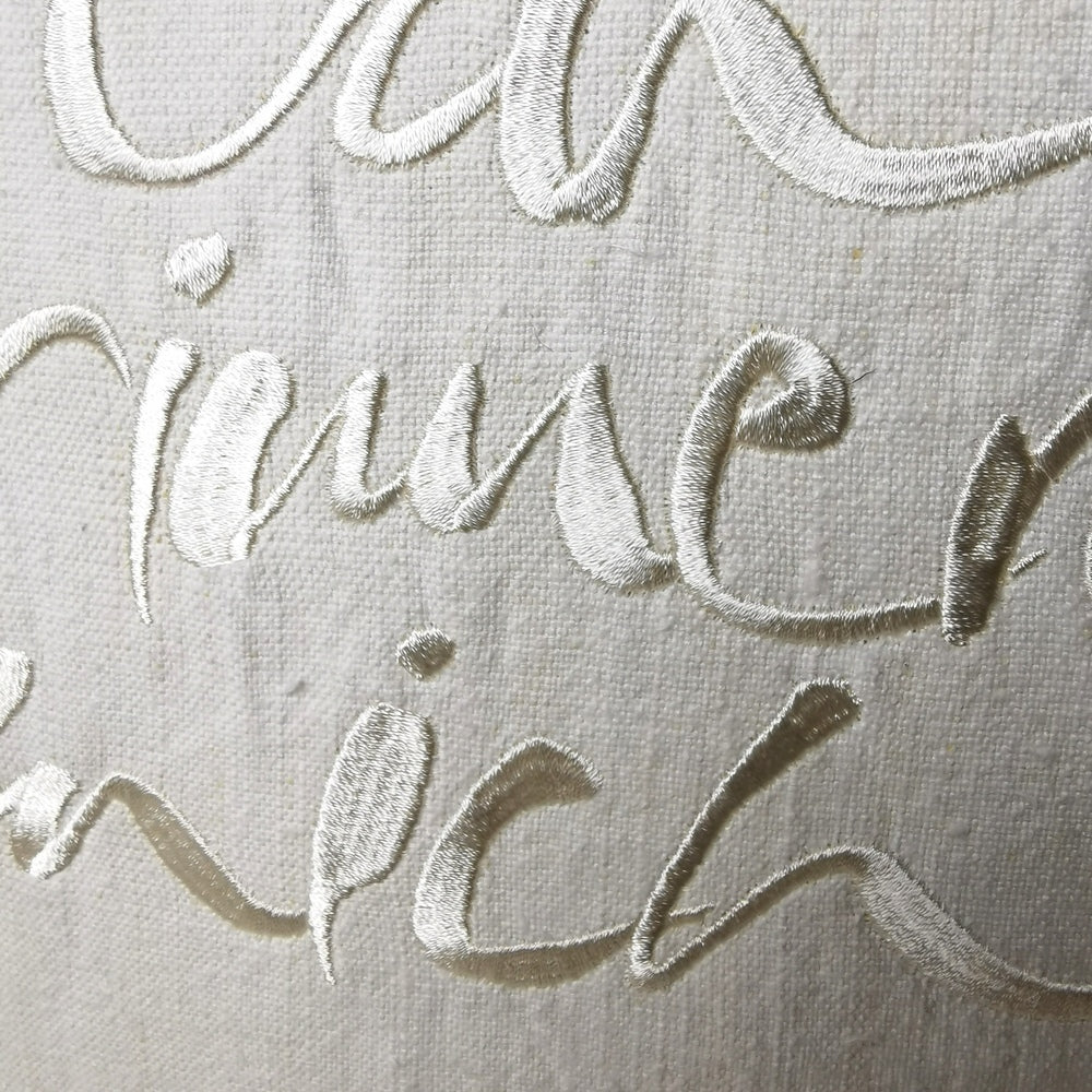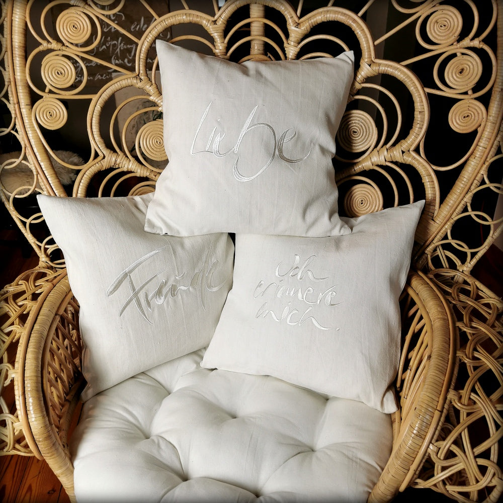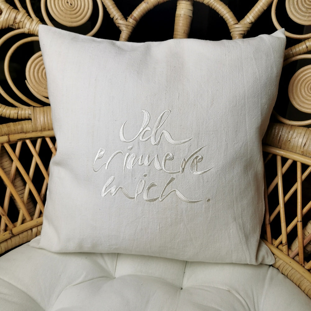 Besondere Kissenhülle aus Bauernleinen – „Ich erinnere mich.“ mit Stickerei