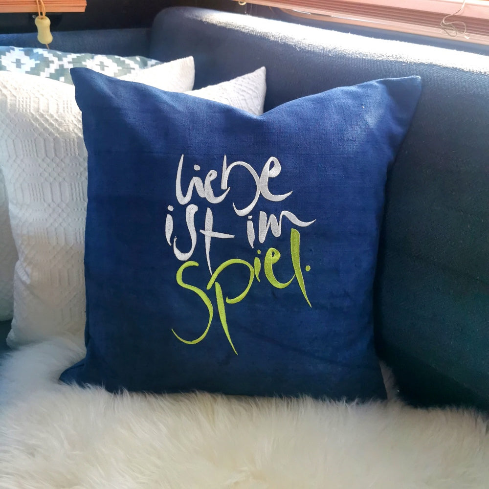 Einzigartige Kissenhülle aus Bauernleinen – „Liebe ist im Spiel“ als handgesticktes Dekokissen