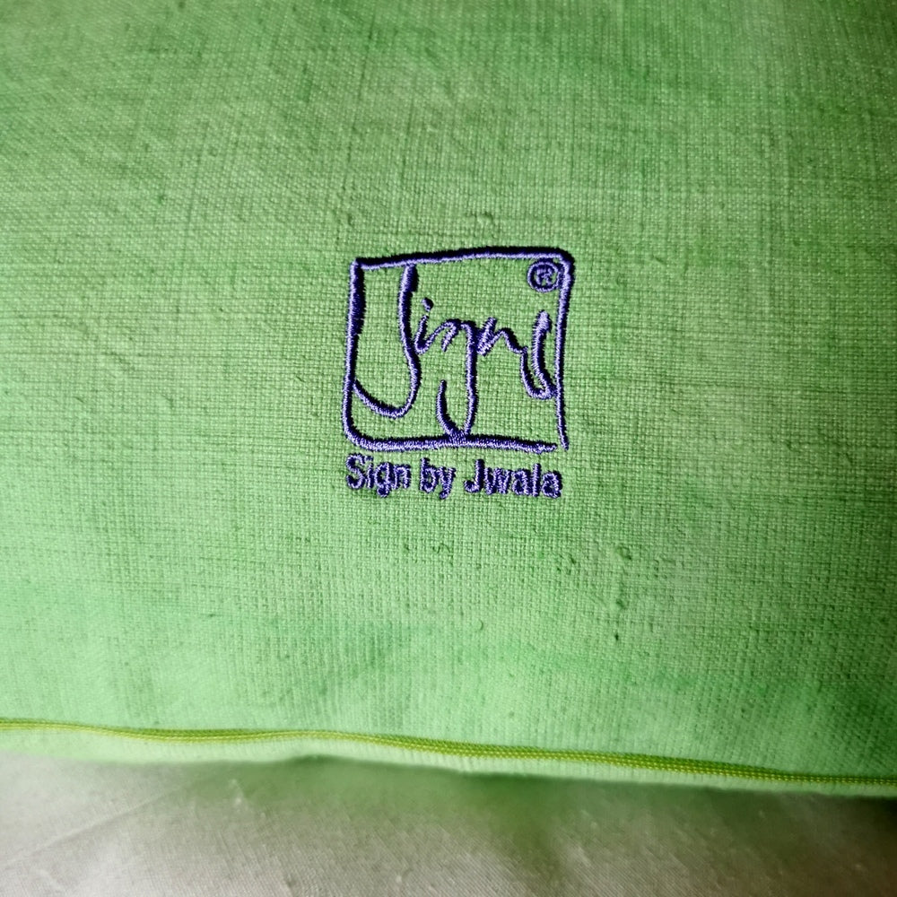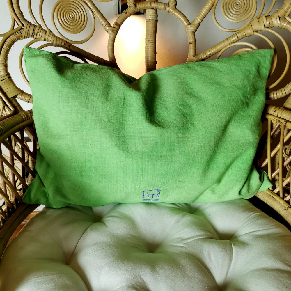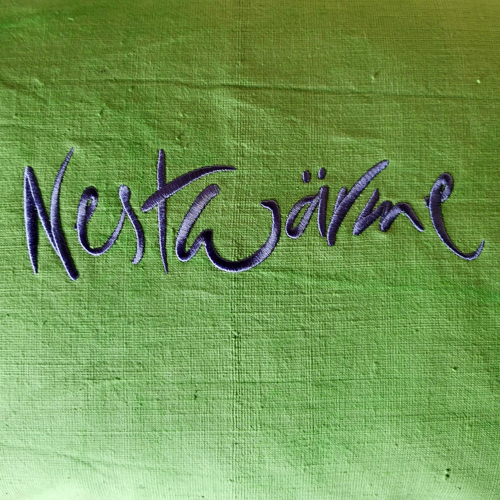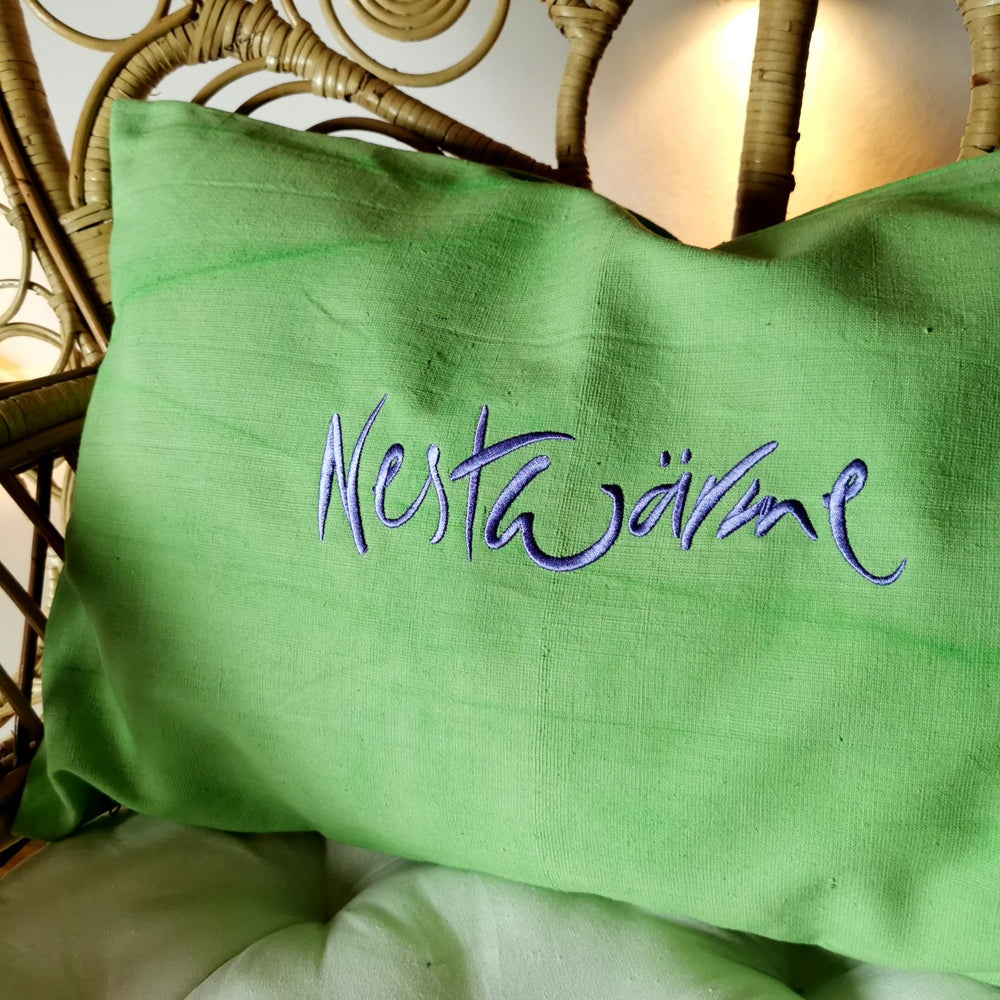 Details: Farbe: Hellgrün Größe: 60 × 40 cm Material: Handgewebtes, antikes Bauernleinen Stickerei: „Nestwärme“ (Sign by Jwala®) in Violett Ohne Innenkissen Limitierte Auflage: 14 Stück