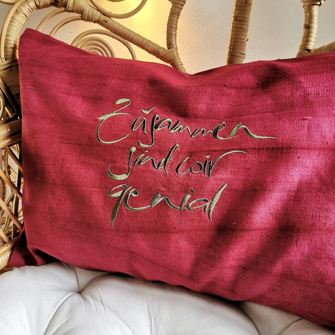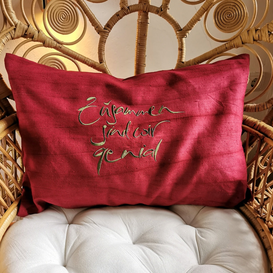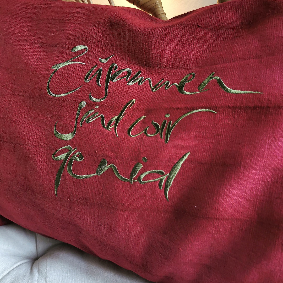 Details: Farbe: Weinrot (Hülle), Olivegrün (Stickerei) Größe: 60 × 40 cm Material: Fein gewebtes Bauernleinen Stickerei: „Zusammen sind wir genial“ (Sign by Jwala®) Verschluss: Reißverschluss Ohne Inlett