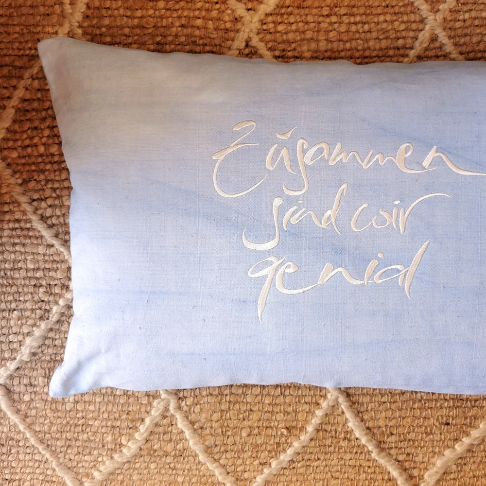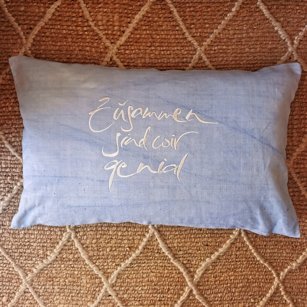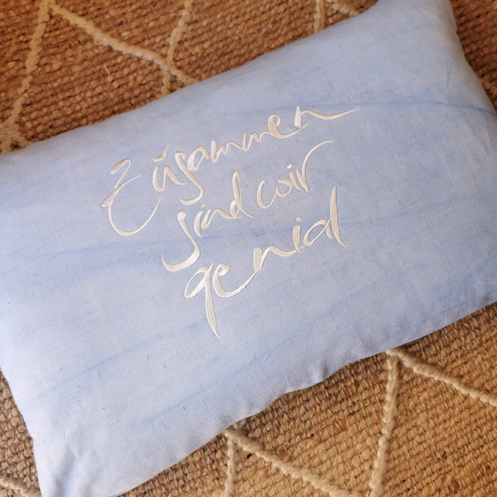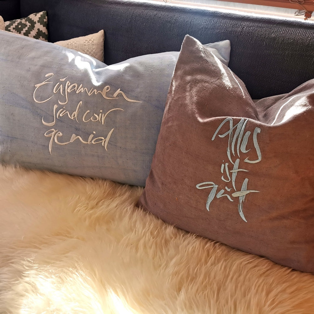 Kissenhülle „Zusammen sind wir genial“ aus antikem Bauernleinen – Einzigartige Handarbeit aus Tirol