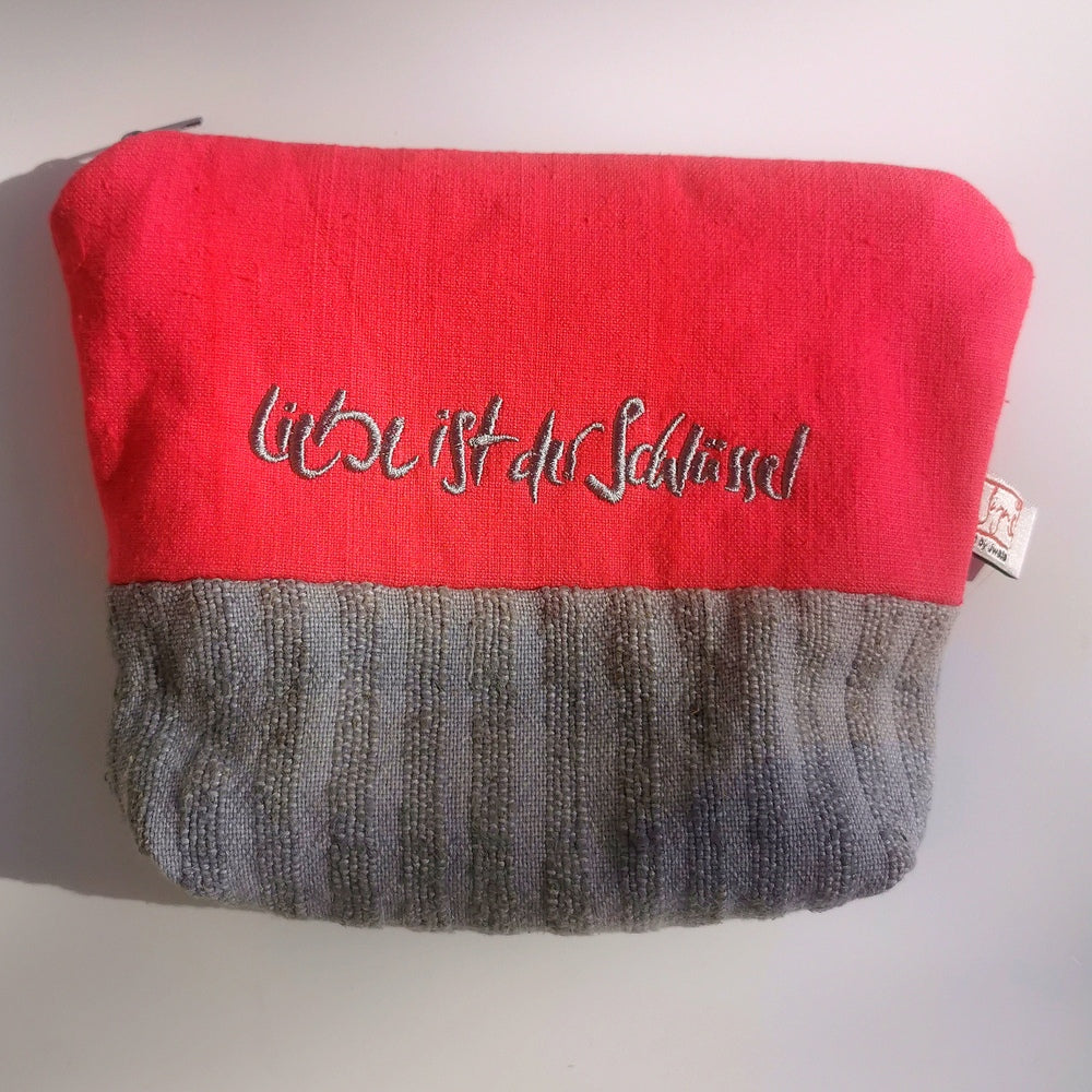 Handgefertigte Kosmetiktasche aus handgefärbtem Bauernleinen – „Liebe ist der Schlüssel“