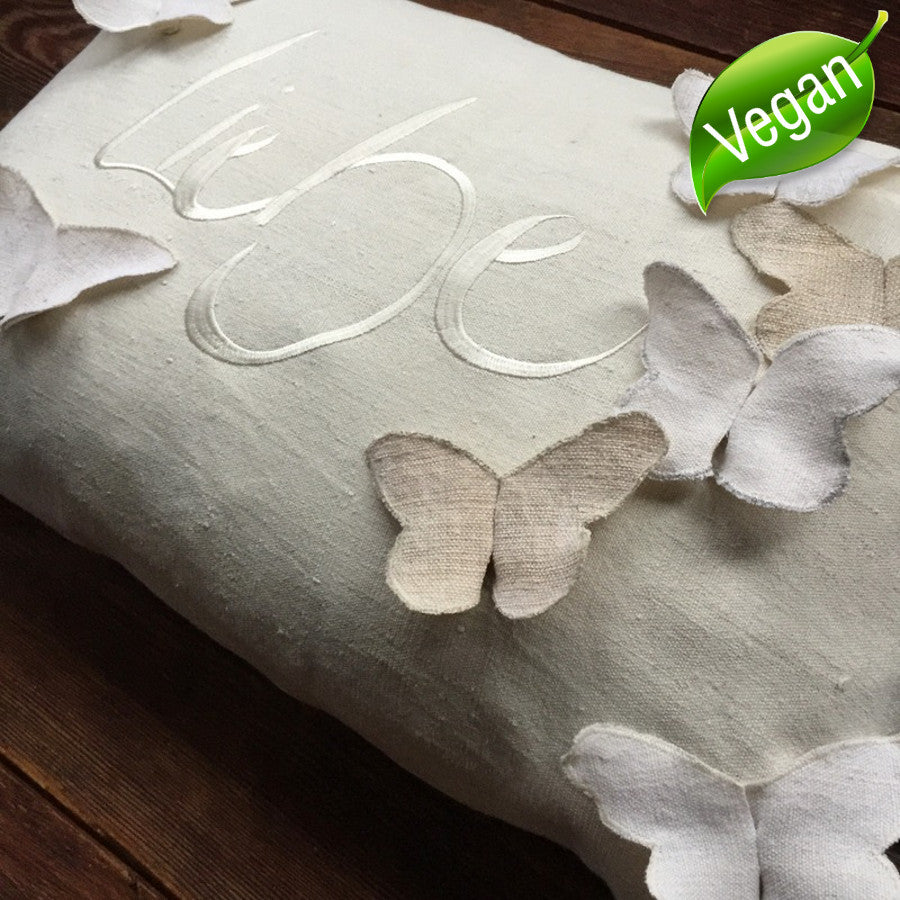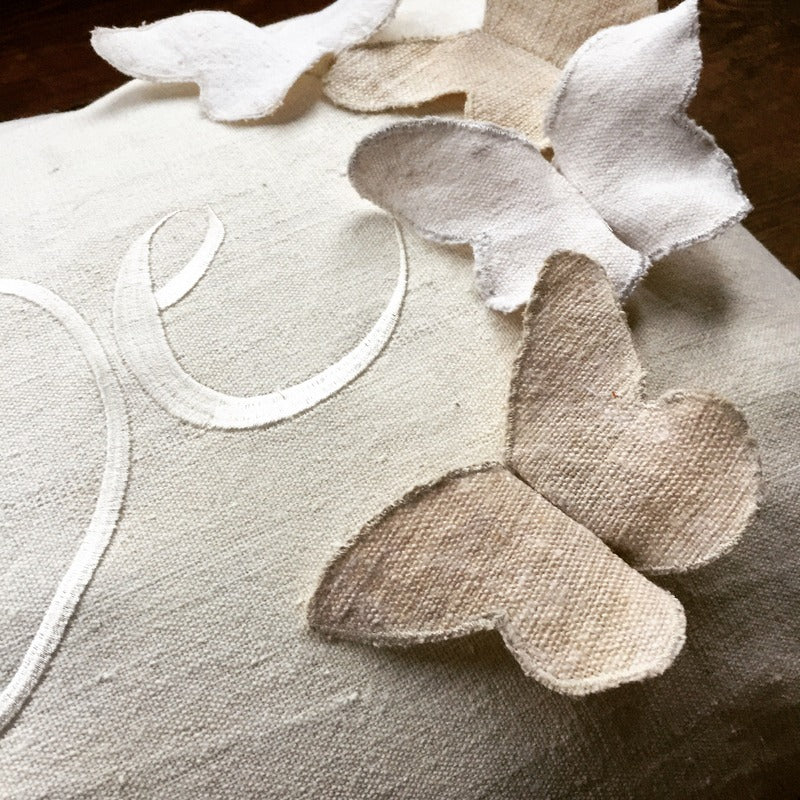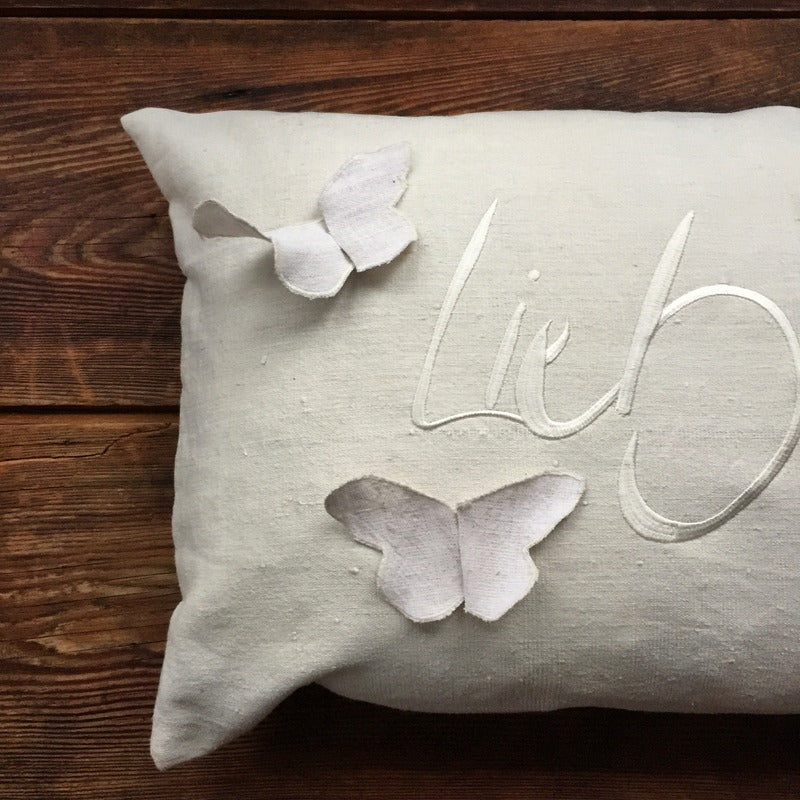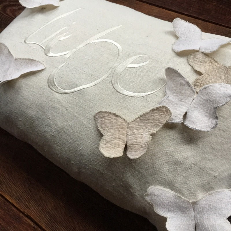 Auf der edlen Hülle aus handgewebtem Bauernleinen tummeln sich sieben fröhliche Schmetterlinge – ein zauberhaftes Symbol für die Leichtigkeit des Lebens und die Verbundenheit mit der Natur.