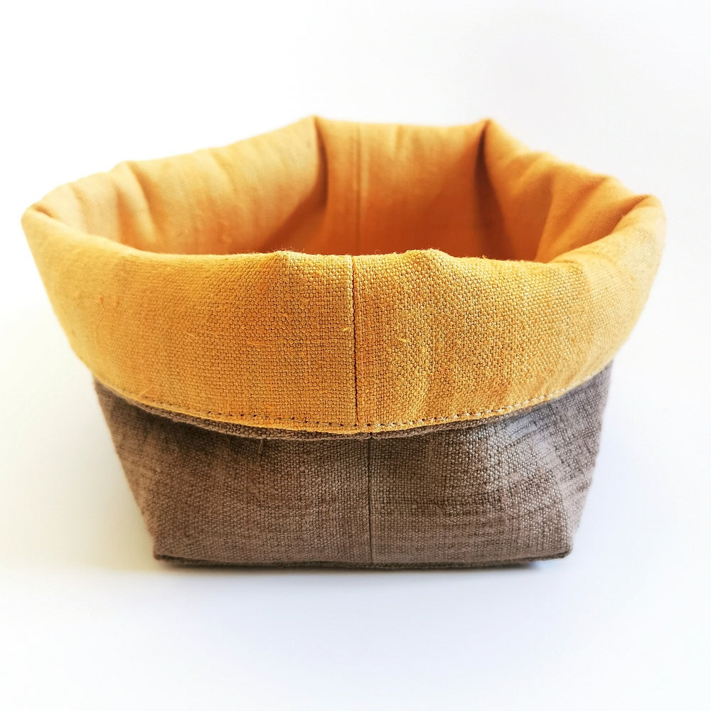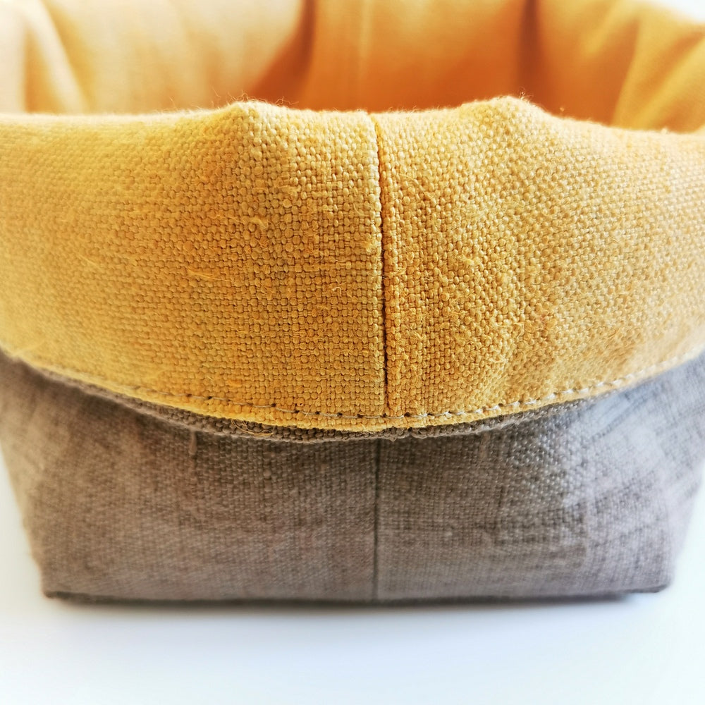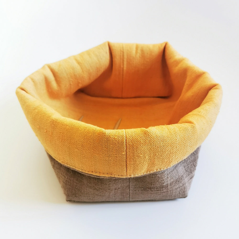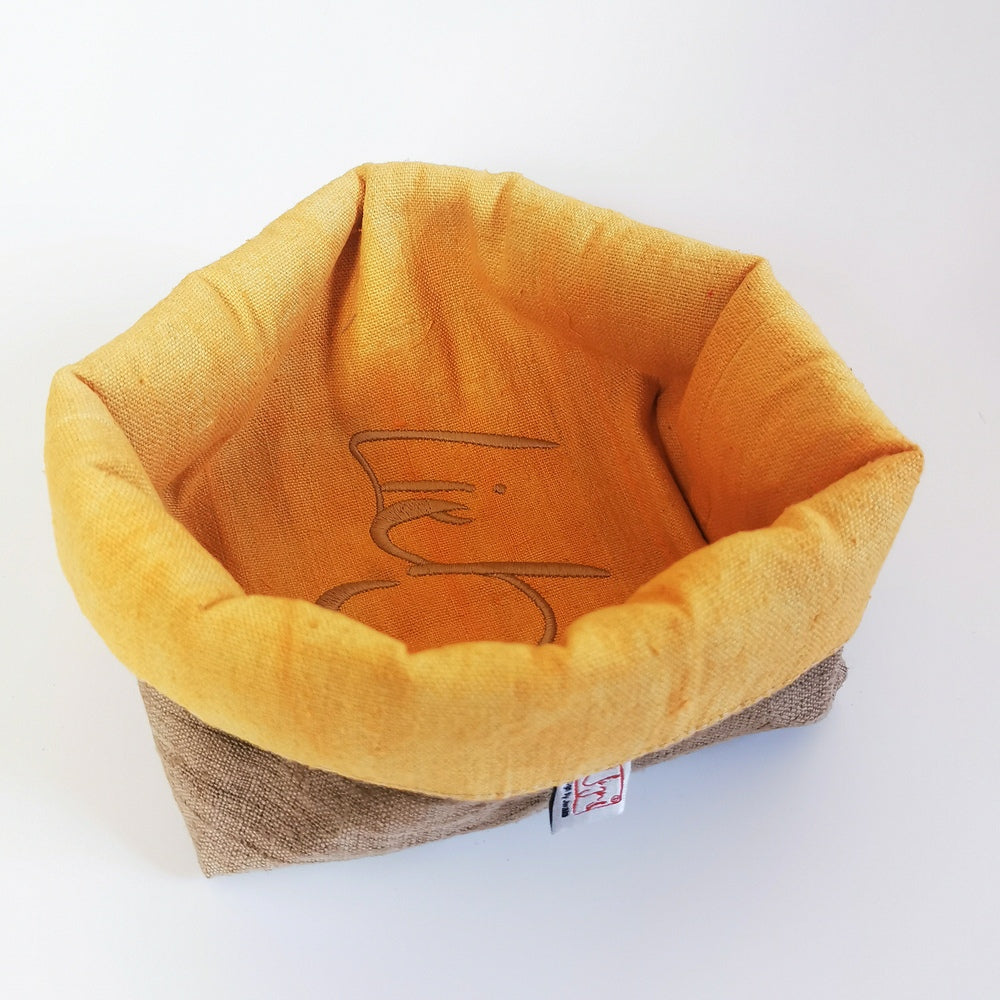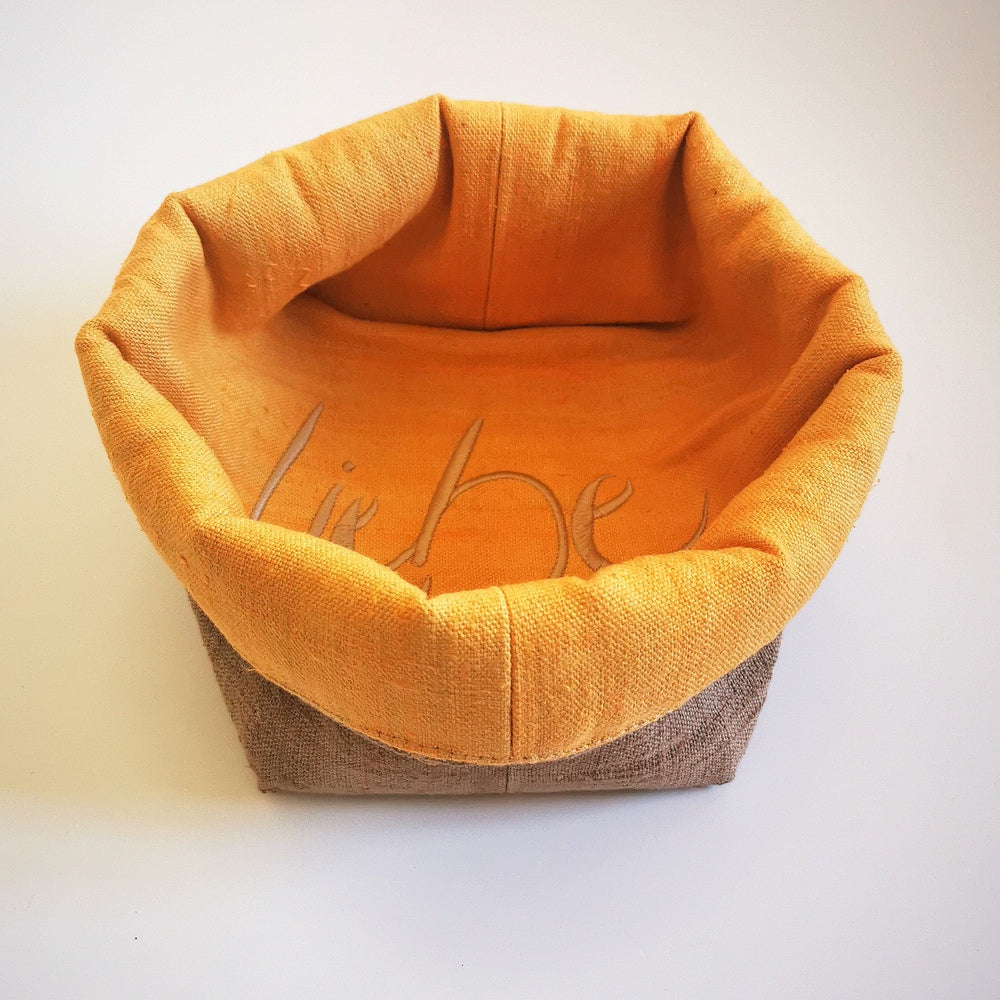 Das Brotkörbchen, handgemacht in Tirol, lässt sich platzsparend zusammenfalten und ist dank der limitierten, nummerierten Auflage (nur 26 Stück) ein echtes Unikat. Außen in elegantem Khaki, innen sonnengelb-orange – ein stilvoller Hingucker für jede Tafel, perfekt als Geschenk oder für den eigenen Frühstückstisch.