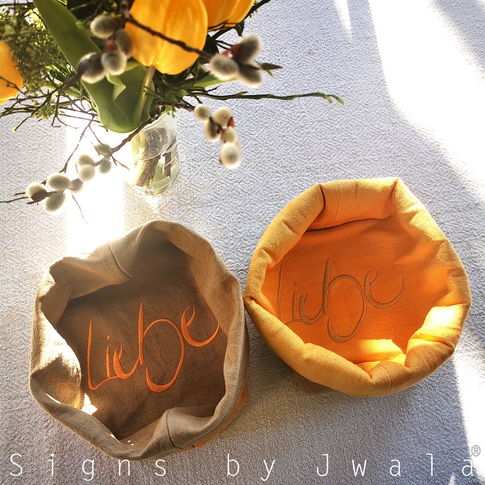 Bringe Herzenswärme und Stil auf deinen Tisch mit diesem besonderen Brotkörbchen aus antikem, handgewebtem Bauernleinen. Das liebevoll von Hand gefärbte und in Tirol gefertigte Brotkörbchen ist mit dem Sign „Liebe“ (Sign by Jwala®) bestickt – so kommt dein frisches Brot oder Gebäck direkt mit einer inspirierenden Botschaft in Kontakt. Die hochwertige Naturfaser sorgt für ein atmungsaktives, langlebiges und hygienisches Brotkörbchen, das sich ideal für bewusste Genießer*innen eignet.