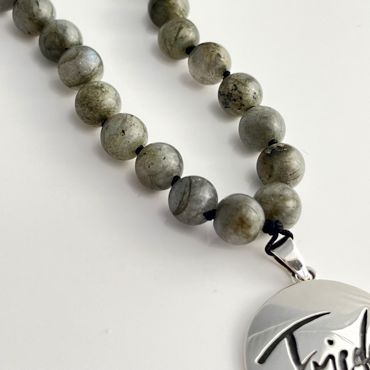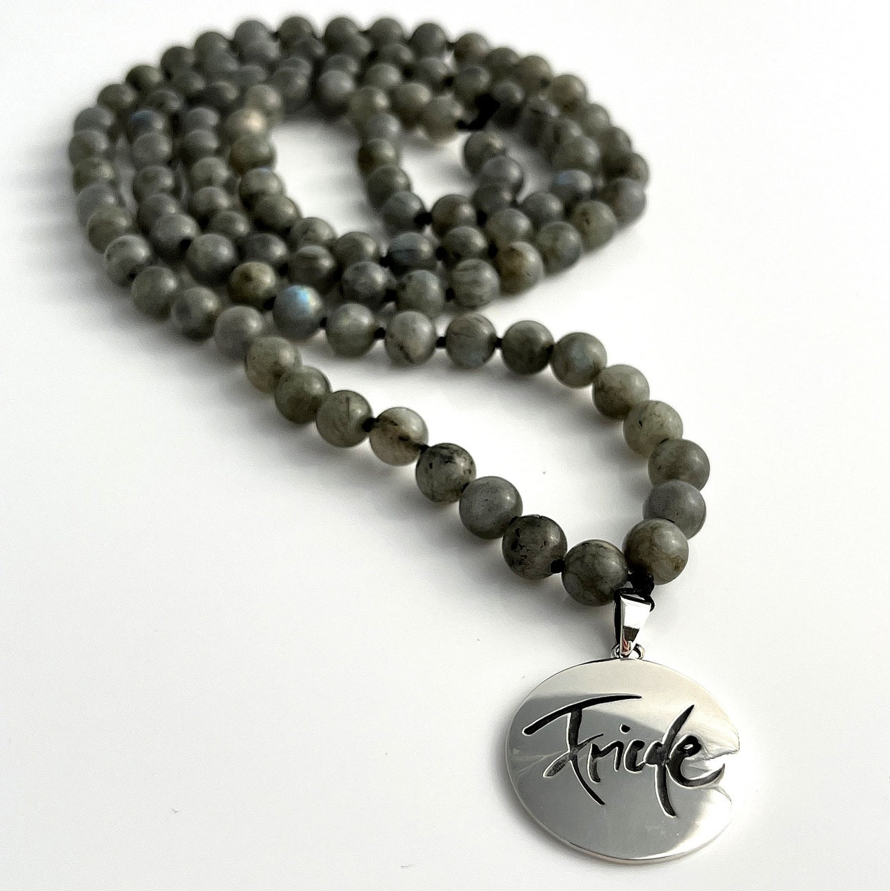 Details: • 108 Halbedelsteinperlen aus Labradorit • Perlengröße: 8 mm • Amulett: Friede – Sign by Jwala® aus 925er Sterlingsilber • Einfache Länge (inkl. Amulett): ca. 50 cm • Verpackung: In einem hochwertigen Täschchen aus 100 % Wollwalk mit Satinschleife