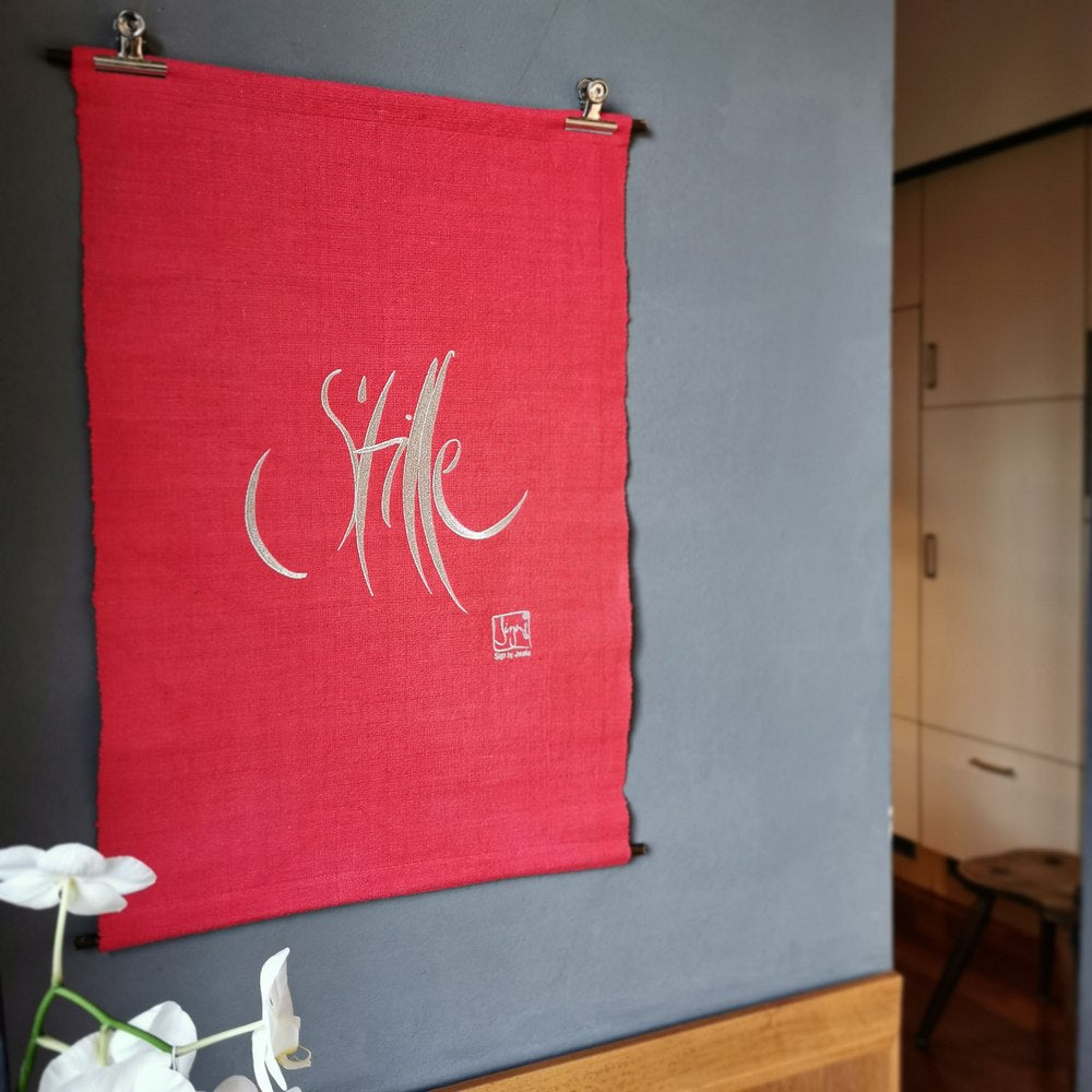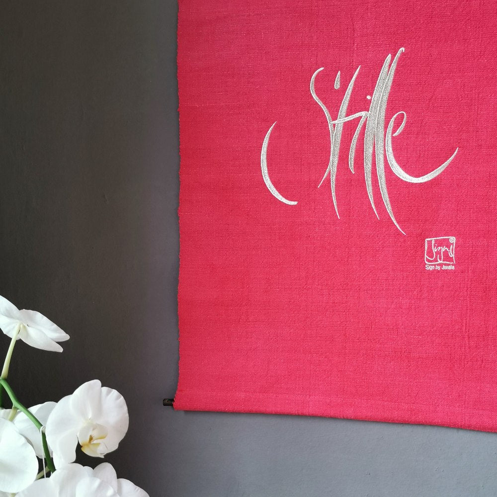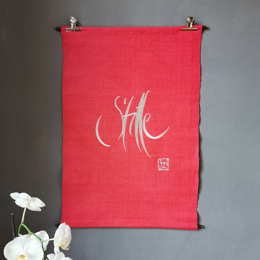 Bringe mit dem Haussegen „Stille“ in leuchtendem Himbeere einen besonderen Akzent spiritueller Wohnkultur in dein Zuhause. Dieses exklusive Wandbild vereint das kraftvolle Sign „Stille“ mit der vitalen Energie der Farbe Himbeere und schafft so eine einzigartige Verbindung aus Ruhe, Kraft und Lebensfreude. Die schimmernde Silber-Stickerei auf feinstem, handgewebtem Vintage-Bauernleinen macht jeden Haussegen zu einem unverwechselbaren Unikat – ideal für alle, die einen inspirierenden Blickfang und eine Quelle tiefer Entspannung suchen.
