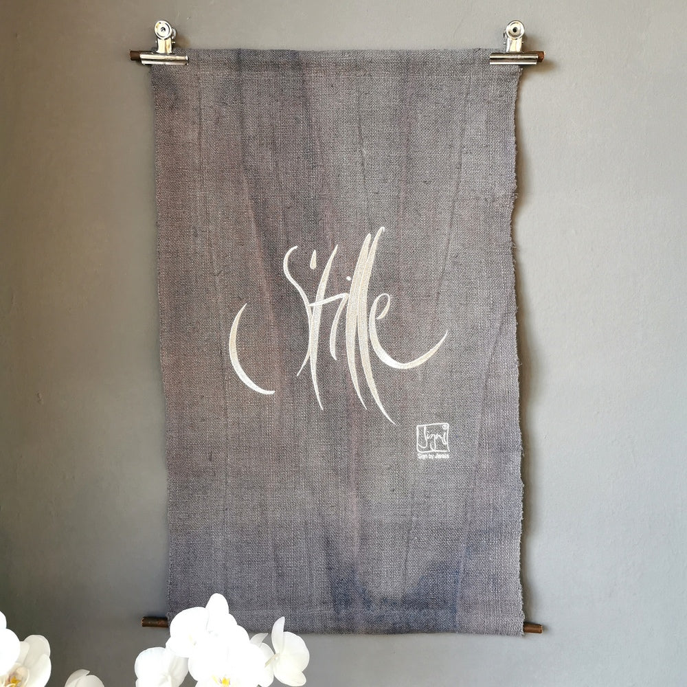 Gefertigt aus mittelgrobem, handgewebtem Vintage-Bauernleinen, das in der Claudiaschlössl-Manufaktur sorgfältig vorgewaschen und handgefärbt wurde, vereint dieser Wandteppich traditionelle Qualität mit moderner Spiritualität. Die edle Silber/Lurex-Stickerei bringt das Sign „Stille“ auf einzigartige Weise zur Geltung und macht jedes Exemplar zu einem exklusiven Unikat. Mit nur 13 Stück weltweit ist dieser Haussegen ein echtes Sammlerstück – ideal für alle, die einen besonderen Akzent der Ruhe und Kraft in ihren Räumen setzen möchten.