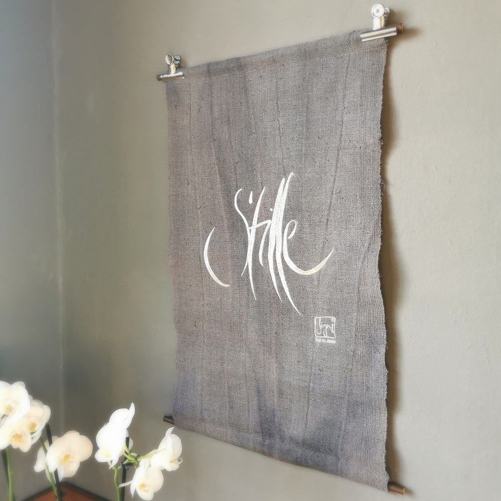 Sign-Haussegen „Stille“ – Wandteppich aus handgewebtem Vintage-Bauernleinen