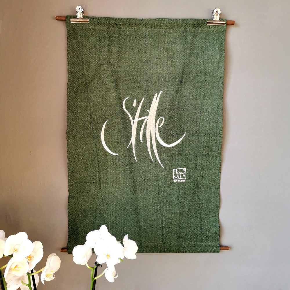 Gefertigt aus grobem, handgewebtem Vintage-Bauernleinen, das in der Claudiaschlössl-Manufaktur sorgfältig gewaschen und gefärbt wurde, vereint dieser Wandteppich traditionelle Handwerkskunst mit moderner Spiritualität. Die edle Silber/Lurex-Stickerei bringt das Sign „Stille“ zum Leuchten und erinnert dich jeden Tag daran, in der Stille Frieden zu finden und neue Kraft zu schöpfen. Jeder Wandteppich ist ein liebevoll gefertigtes Unikat – limitiert auf nur 7 Stück.