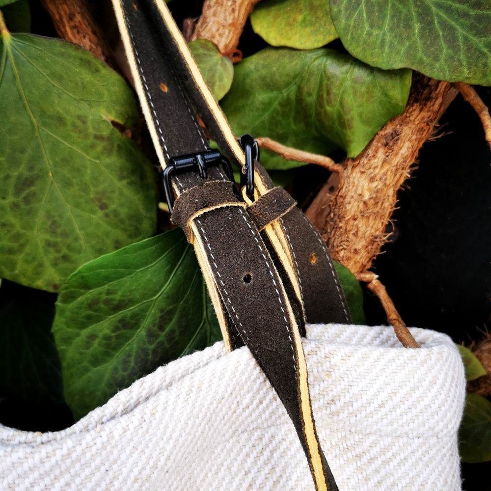 Schultertasche aus Bauernleinen – Handgefertigte Stofftasche mit Hirschleder-Riemen aus Tirol