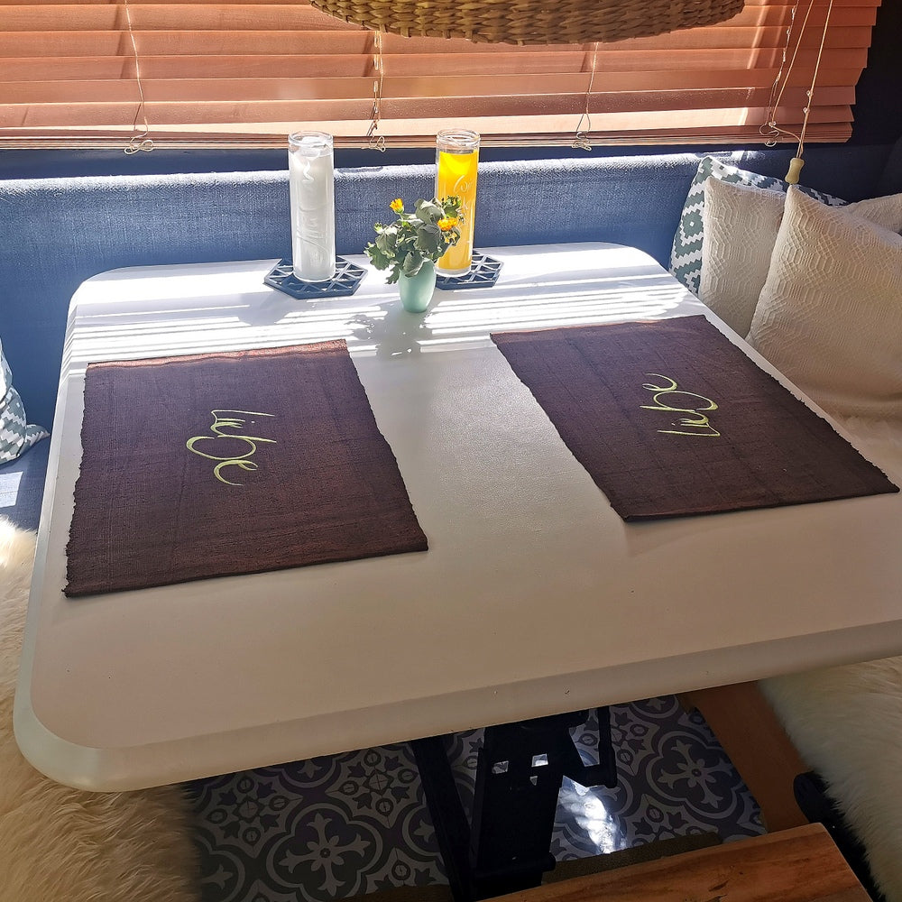 Tischset aus antikem Bauernleinen mit „Liebe“-Stickerei – handgemacht in Tirol