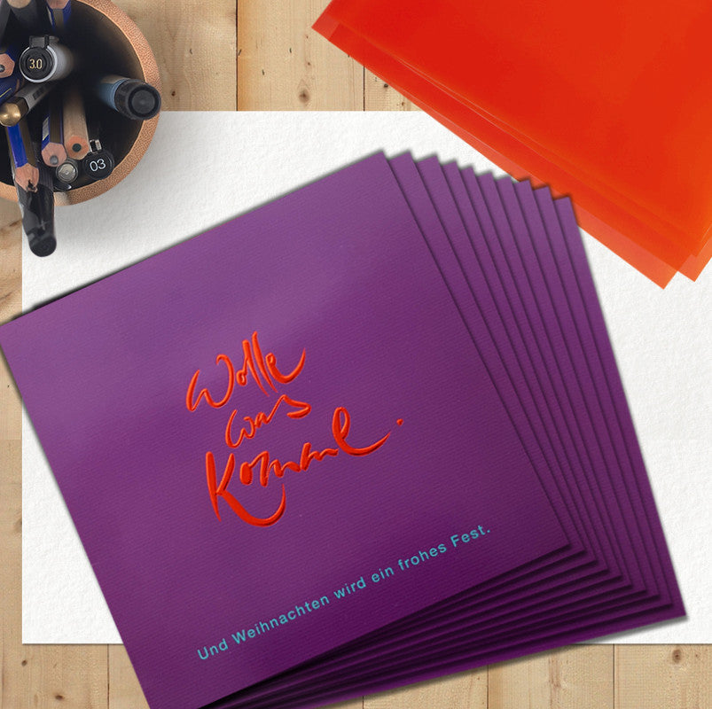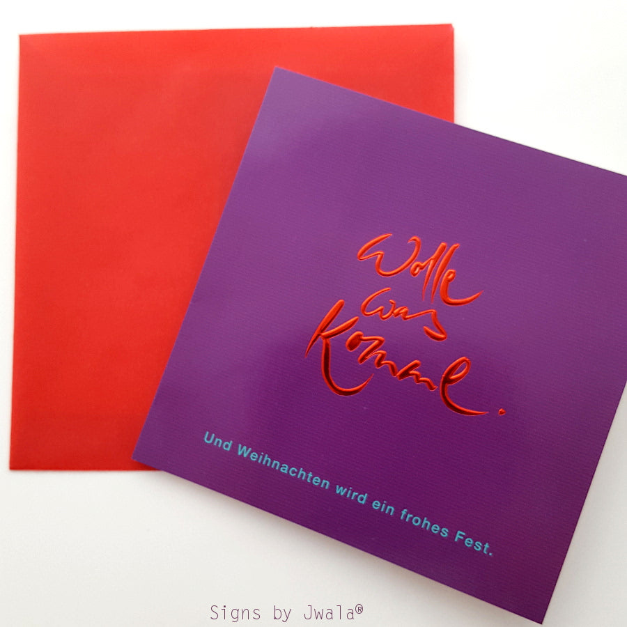 Entdecke besondere, spirituelle Grußkarten für Weihnachten: Dieses exklusive Set enthält 10 quadratische Klappkarten mit liebevoll gestaltetem, transparentem Einlegeblatt und leuchtend roten, transparenten Kuverts. Die Karten sind außen in edlem Violett mit feinen Streifen und innen klassisch weiß gehalten. Die inspirierende Botschaft „Wolle, was komme. Und Weihnachten wird ein Frohes Fest.“ (Sign by Jwala®) ist in roter Folienprägung veredelt und lädt dazu ein, das Leben bewusst mitzugestalten und Freude zu verschenken. Ideal für alle, die zu Weihnachten mehr als nur Worte übermitteln möchten – diese hochwertigen spirituellen Grußkarten bringen Herzenswärme und Sinn in die Festtage. Perfekt als besondere Weihnachtskarte, für Herzensmenschen oder als Geschenk. Jetzt online bestellen und spirituelle Grüße verschicken!