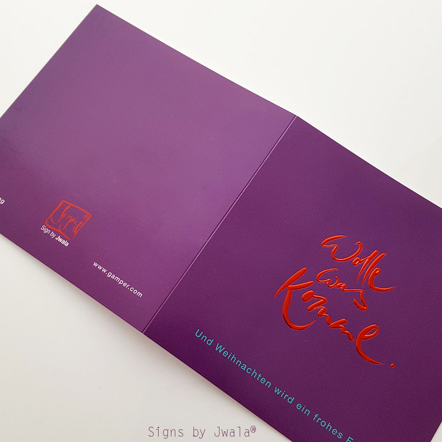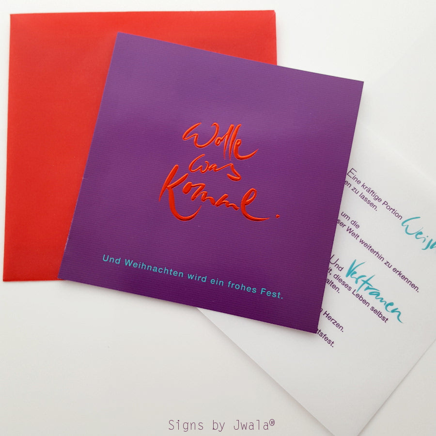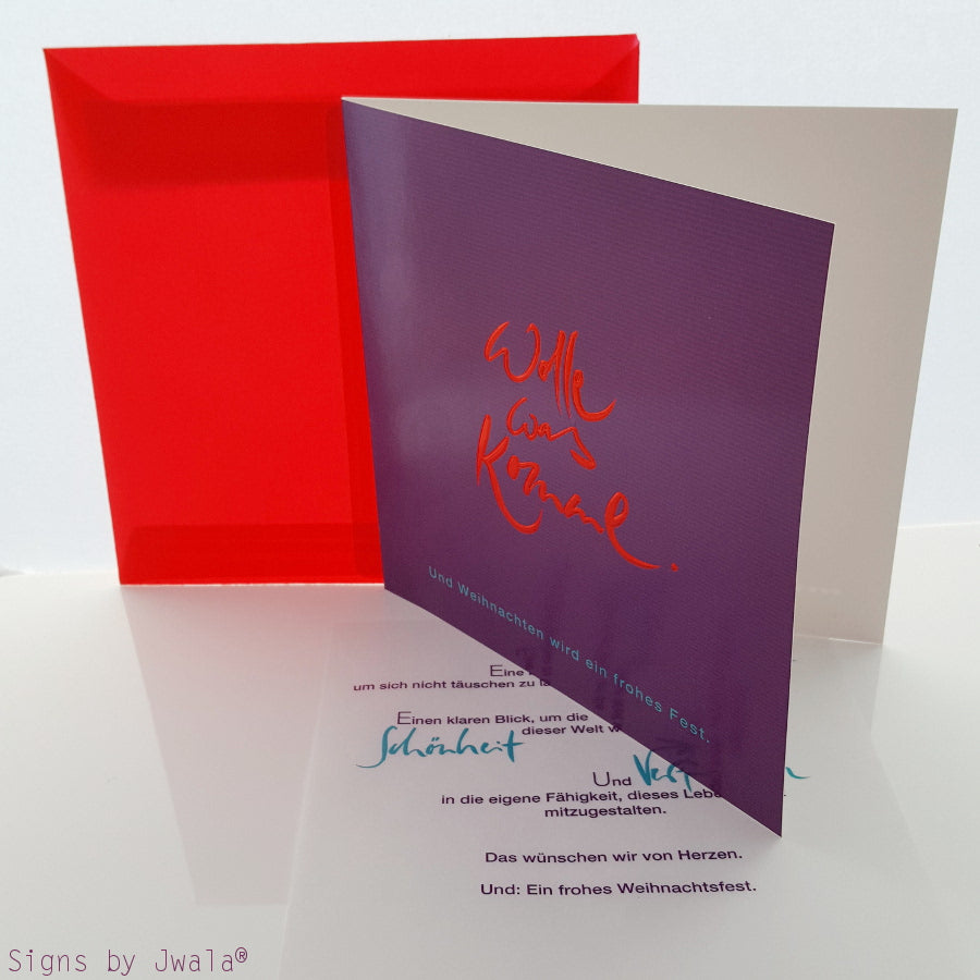 Entdecke besondere, spirituelle Grußkarten für Weihnachten: Dieses exklusive Set enthält 10 quadratische Klappkarten mit transparent bedrucktem Einlegeblatt und rot-transparenten Kuverts. Die Karten sind außen in edlem Violett mit feinen Streifen gestaltet und tragen die inspirierende Botschaft „Wolle, was komme. Und Weihnachten wird ein Frohes Fest.“ (Sign by Jwala®) in roter Folienprägung. Das Einlegeblatt ist mit einem liebevollen, spirituellen Weihnachtsgruß bedruckt und schenkt Weisheit, Klarheit und Vertrauen – perfekt für alle, die zu Weihnachten mehr als nur Worte verschenken möchten. Ideal als besondere Weihnachtskarten, spirituelle Grußkarten oder als Geschenk für Herzensmenschen. Jetzt online bestellen und festliche Freude verschicken!