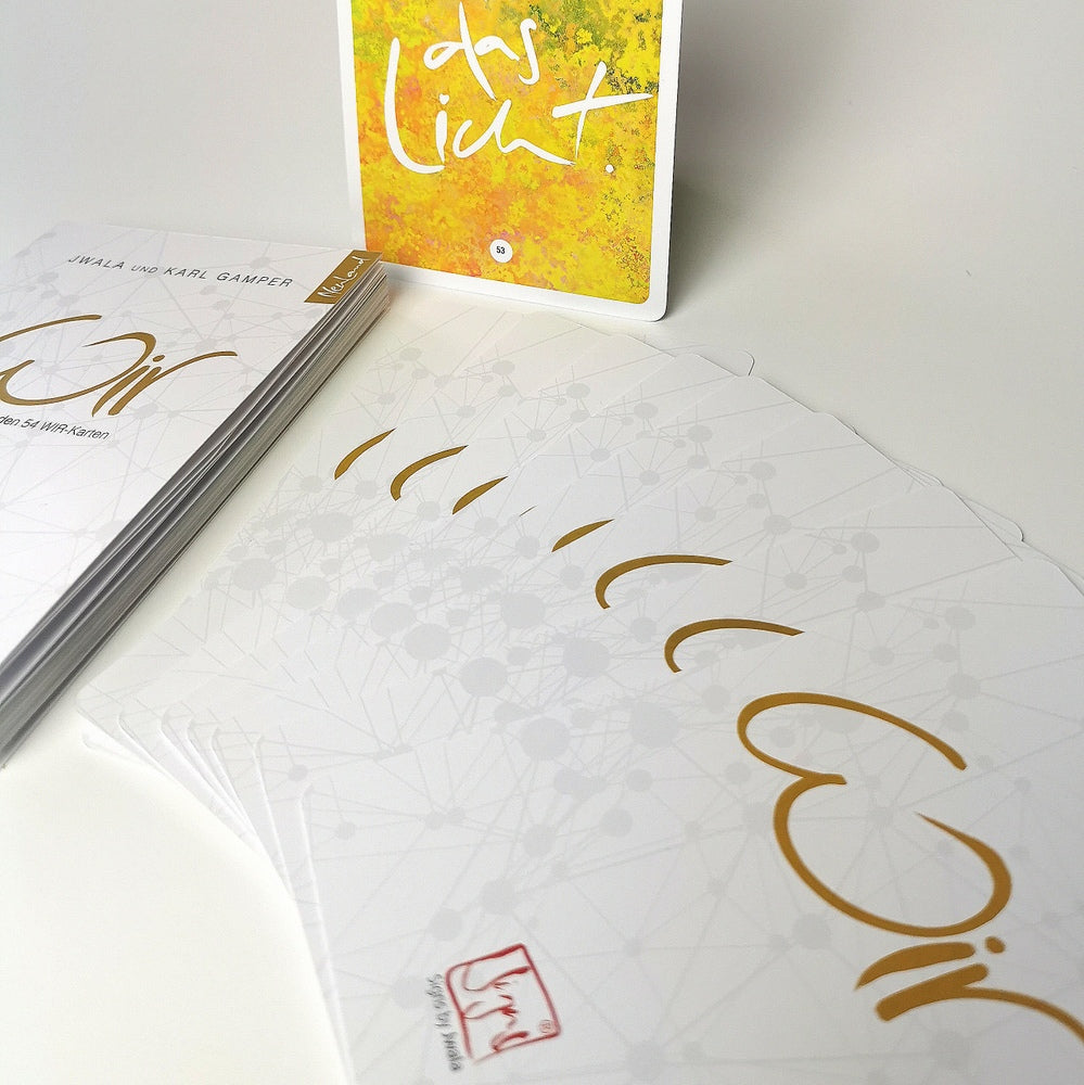 Die WIR-Karten verbünden uns mit der Supermacht des Universums, der Liebe. Sie laden zu einem Frieden, der kein Gegenteil kennt. Sie erinnern, dass wir Mitwirkende sind bei der Entstehung einer neuen Schöpfung – geformt aus unseren kühnsten Träumen. Und daran, dass diese Wirklichkeit, die jeder miterschafft, uns und den Generationen nach uns ein Paradies auf Erden schenkt. Sie offerieren einen inneren Aufstieg, der uns die nächste Dimension eines Miteinanders öffnet; ein WIR, das uns zur höchsten Ehre gereicht.